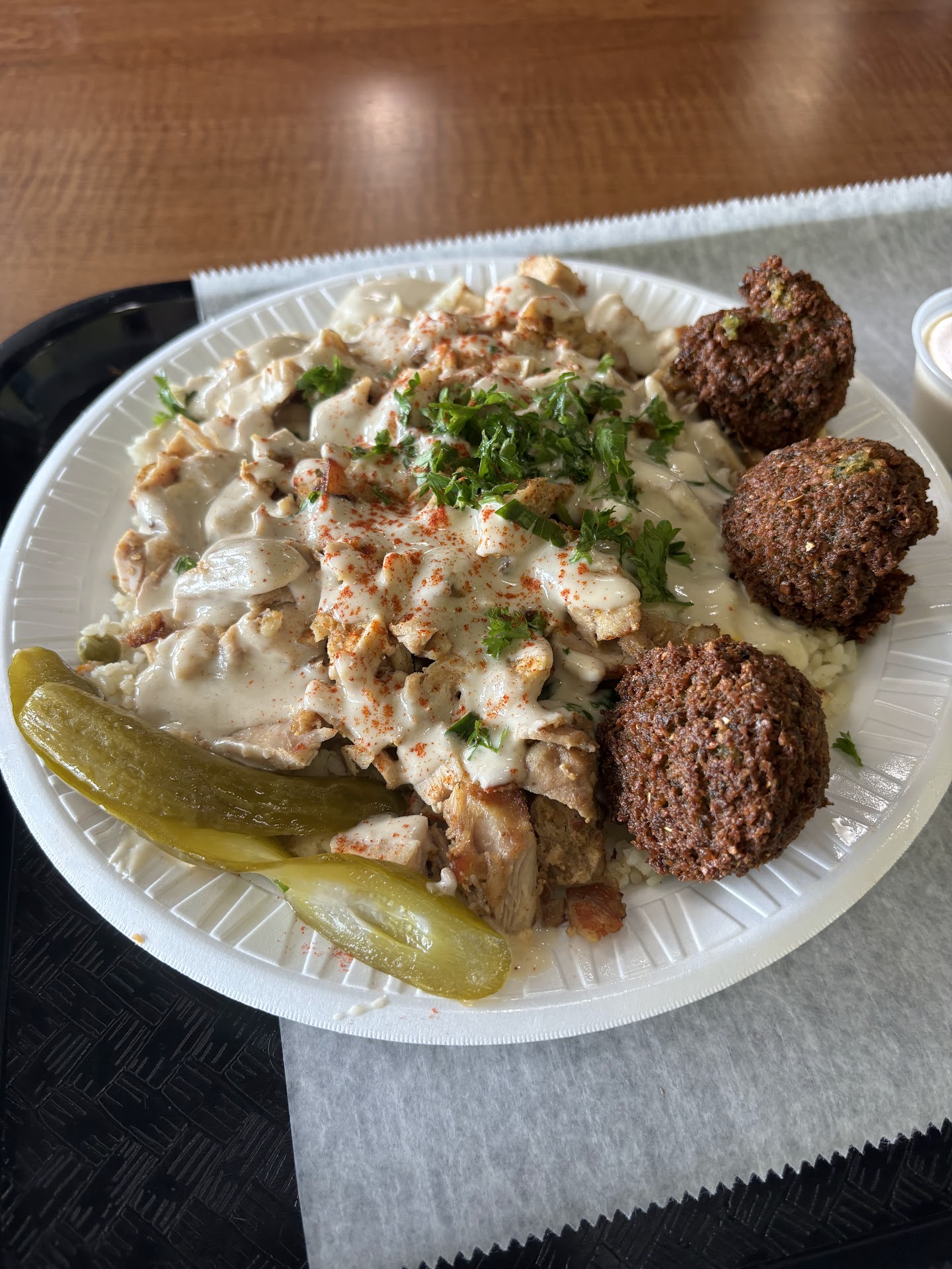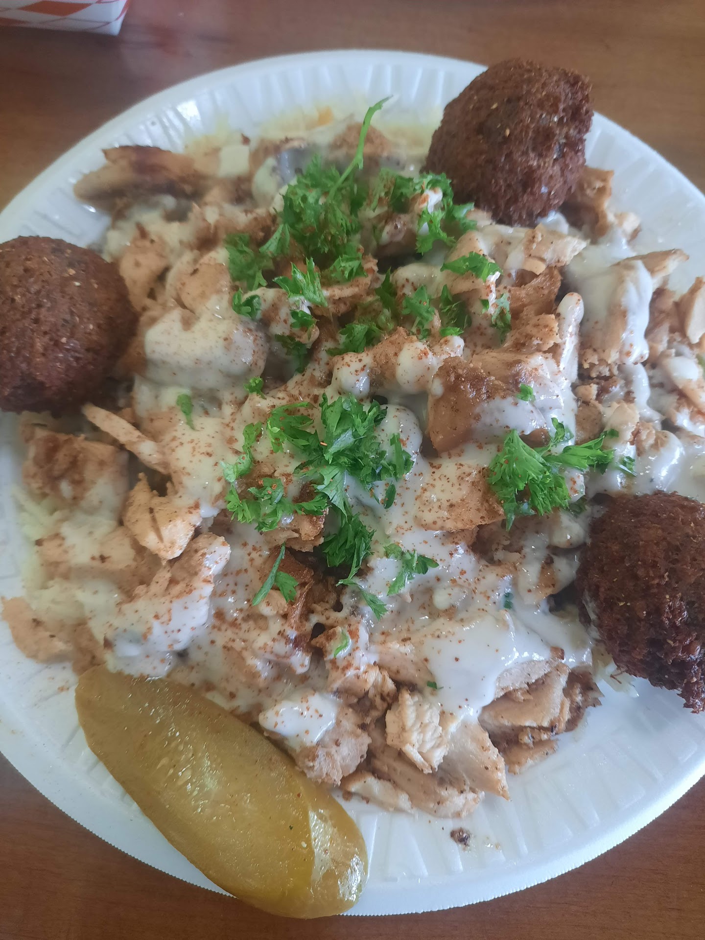 Read moreDon't let the plastic tableware fool you; this is not "fast food". Once you order there is a bit of a wait, and why? Because they are preparing it fresh, and when it arrives it is hot and beautifully garnished. I've been eating falafel since long before most Americans ever heard of it, and let me tell you, it's very good here. Fried dark and crisp, but not oily. The hummus was rich and garlicky, and the babaganoush was rich and spicy. I also had the beef and chicken shawarma, which was tender and delicious. The pita was warm and soft. Okay, you're forcing me to find something to complain about...? Fine: The pita was sliced in half, which, because it was so soft, sealed the opening which made prying the pocket back open a bit of work. Okay? That's the only negative about the whole experience. Prices are reasonable. Nice and clean. Awesome A/C like a walk-in cooler. 5G WiFi. I thought the canned & bottled soft drinks a bit overpriced, but pitchers of ice water are free. I knew it was a good sign when I saw the parade of brown skin picking up orders as I ate: folks raised on this food come here! And I will definitely...