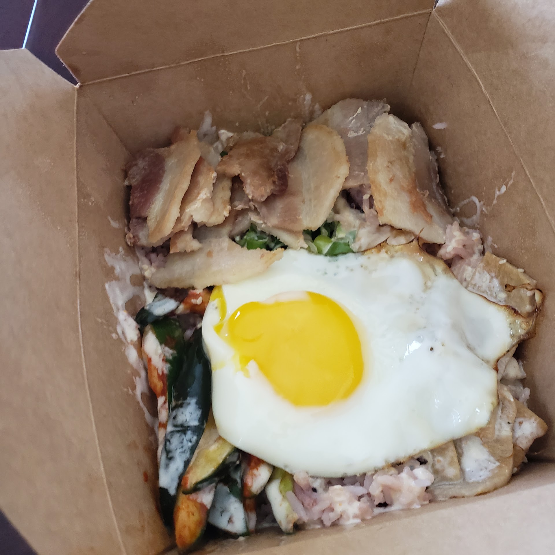 It was my first time here, and the girl behind the counter was really sweet and helpful. I ended up getting the purple rice as my base and the bulgogi as my protein. You can choose 5 toppings; I went with the edamame, green onions, corn, radish, and cucumbers. Some of the ingredients didn't look the freshest, but that's a typical downside of BYOB places in lieu of convenience. (Everything still tasted good though). For sauces, I went with the employees recommendation of yum yum sauce and gochujang.