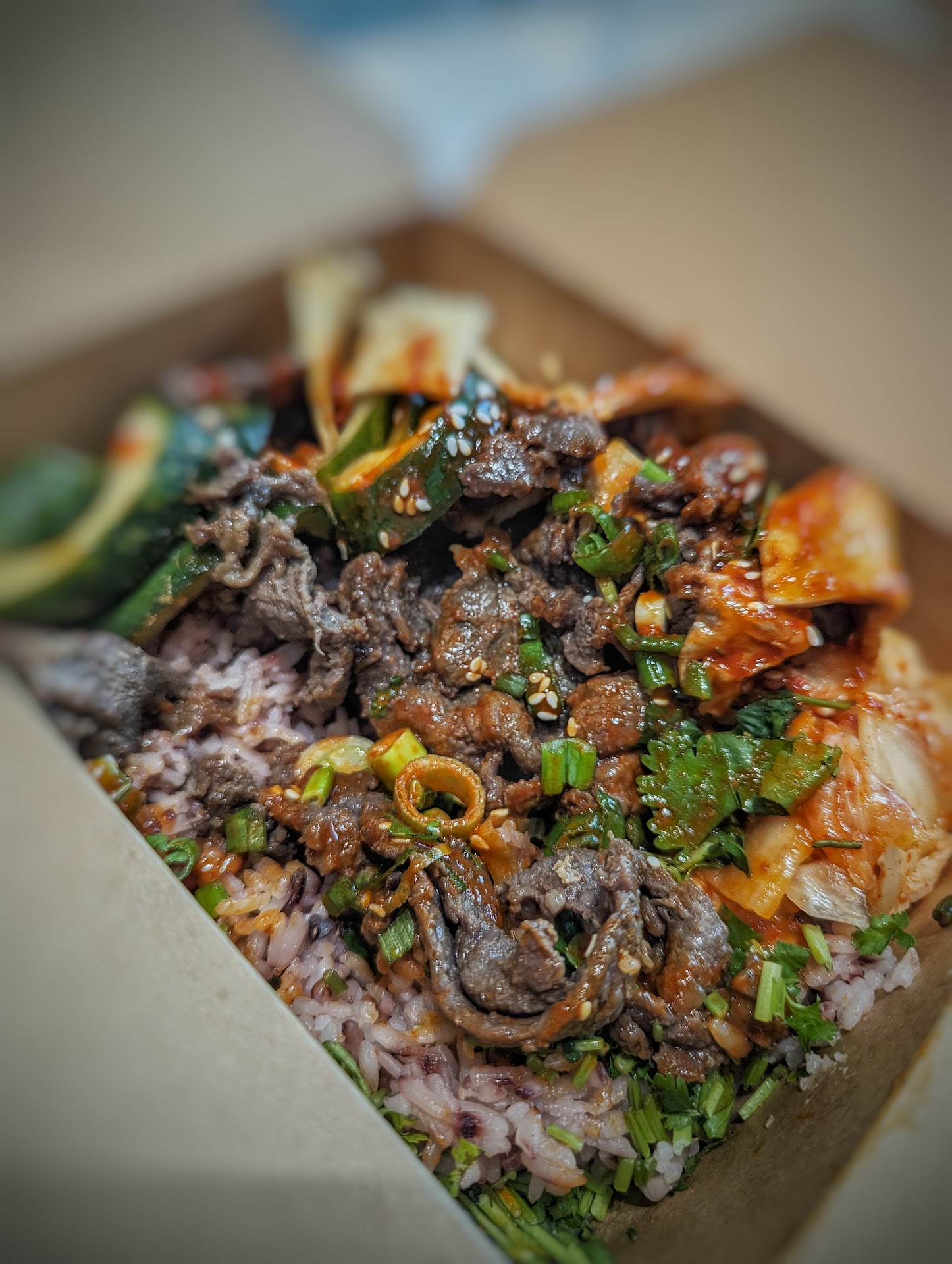 The food is where the wheels started to come off. I ordered a custom bowl with rice and bulgogi. Among my choices, I had regular kimchee, their version of oi-sobagi (cucumber kim chee), and some odeng (fish cake). Both Kim chee dishes had mild heat and acid with just enough flavor to make it passable as a kim chee. The odeng, although the right sponginess, didn't have much flavor to it at all. Those items I could deal with. The real issue for me was that both the bulgogi and rice were both very cold and almost flavorless. I'm unsure of the style of Korean inspired food but I'm accustomed to warm/hot meats and rice with cold sides that have spicy heat. I finished my food because it wasn't terrible; it...