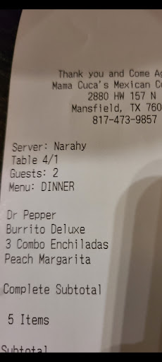 Read moreWe haven't been to Mama Cucas in a while. We used to come all the time when they first opened, our son loves their tortilla soup, but he's grown and lives in another part of the state. But we decided to try it again, for a Friday night, we didn't wait long for a table. We had chips and salsa and were greeted by our server within the first few minutes of getting seated. If they ask you if you want the green salsa, its good, but it is spice-eeee. We ordered Tacos de Mexico, Chicken enchiladas, a flauta, Fajita nachos, and the tortilla soup, and the food was out in record timing, less than 10 minutes, and it was all fresh and delicious. We saved room for dessert, my husband had sopapillas, and I had the pecan pie. I know what you're thinking pecan pie at a Mexican restaurant? YES and it was delicious, they bring it out and prepared it at our table on a hot skillet plate with ice cream, caramel drizzle and something else that is super yummy, it was probably milk but who cares it was delicious!!! It's one of those dishes that everyone orders after they see the first person get it. One lady was staring my pie down, and I thought I was going to have to fight her over it. Since we had sopapillas, we dipped those in the sauce made by caramel drizzle. Thank you, Mama Cucas, for the great ending to my...