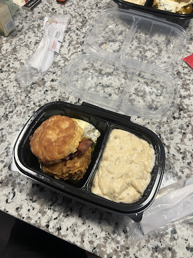 Read moreThis is hands down the worst breakfast I have ever had. How do you mess up a biscuit so horribly when you are a biscuit company? It was way overpriced. We spent $70 and $50 of it went in the trash. My teen son ate his chicken and waffles but complained about it being dry, flavorless, and burnt. I had a bacon, egg and cheese biscuit. It had one bite of bacon, literally one bite. The biscuit was dry like sand and stuck in my throat. It was also burnt. The egg was burnt and it had a large chunk of eggshell. So much so that it was all stuck in my teeth and felt like I had chewed a piece glass. And the food had zero flavor. My daughter's mini cinnamon biscuits were rock hard and you are supposed to get 3. She got 2 and 1/4. The gravy was so thick that the spoon stayed standing upright with only about half of the tip in it. It was the consistency of cottage cheese. Service was meh, she wasn't friendly or helpful at all but also wasn't overly rude. We tried feeding some of the food to my 4 large dogs but even they would only eat the bacon. They will usually eat anything. I would rather eat undercooked powdered scrambled...