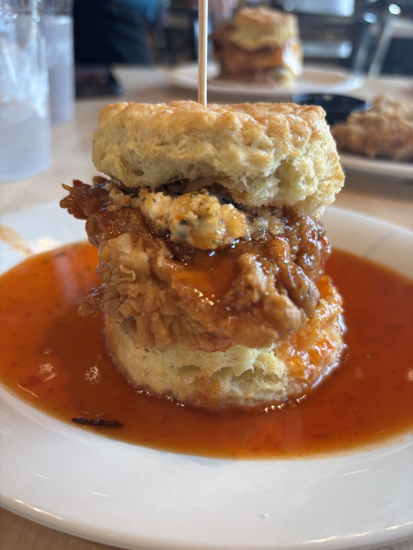 First thing first, the food at Maple Street was good! My husband and I ordered the Squawking Goat, the Farmer, and fried green tomatoes to share. The squawking goat had a great combo of goat cheese and red pepper jelly, although I felt like the biscuit was drowning in the red pepper jelly.. a drizzle would have been just the perfect amount. The farmer was a very tasty and unique rendition of a chicken biscuit. Fried green tomatoes were cut too thick as they were barely cooked inside and the tomatoes themselves were crunchy. The batter was good though.