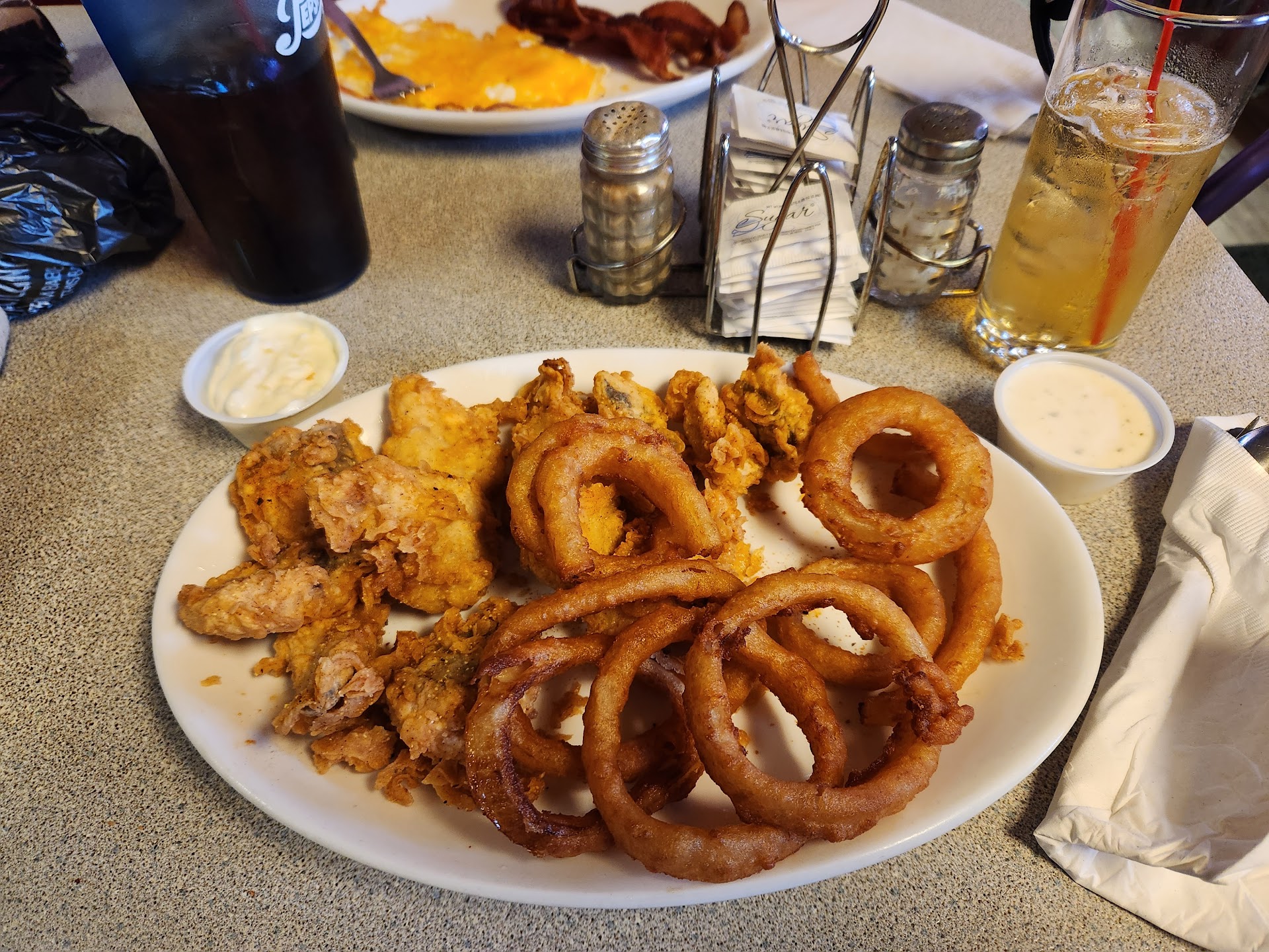 The onion rings are great, but there were only five of them. Portion size is rather small. I say stick with the fries.