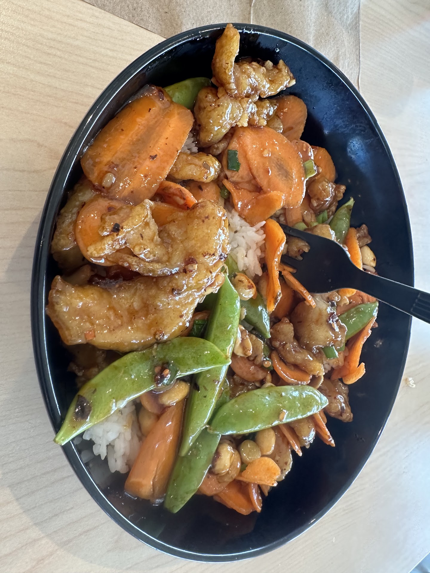 I ordered the Kung pao chicken with brown rice and a side of lettuce wrap sauce. My usual go to is Kung pao beef with Brown rice however I did not see it on the menu and that may have been my oversight. The presentation was great, bright veggies and a good portion but the Kung pao sauce seemed sweeter than I remember having in the past, the peas were paper thin and the overall meal just tasted different, not bad per se, but not what I was expecting.