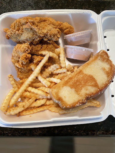 Read moreThe food was good but what happened? The fries aren’t the thick ones anymore and the tenders are much smaller than they used to be. Besides the food though, my box had oil melts all inside of it everywhere. There weren’t any paper between the food and the box so I’m sure I got some styrofoam box melted onto my food. It wasn’t even just a few melted areas either. It was at every inch of the box and the oil burns were about an inch or two in size each. Employee was nice, food came quickly, and it gave me enough energy to get through my 3 matches that I had an hour later. They really need to add some kind of layer to prevent the box from melting from oil. I don’t even know if the food should still be dripping with that much oil when they put it in...