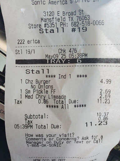 The person that cash me out name on receipt say “erica” she was rude in my opinion. I just end up pulling off after letting her know I stated I wanted fries. She claim she didnt hear me when I stated I would take the med pop corn chix, fries and a coke. And let me remind you, she said you cannot do a combo on small popcorn chicken. She end up giving the other cars their food and not acknowledging me. Even a “ok ma’am fries will be right out.” She just walked away mad it’s not even that serious. Should’ve known it’ll be something when I tried to pay half cash half card and couldnt because of their policy. Shoot what if I financially needed to do it that way. I love sonic normally, but why treat people crazy. Just quit if...