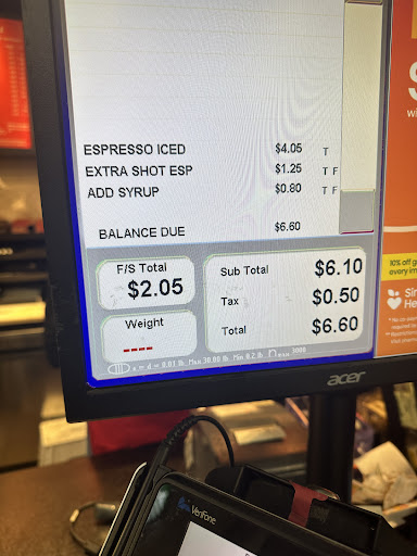 My drink is 5 shot esp with 6 pum white moca, it will be 4.05 and EXTRA shot is 1.25 . But she don't charged me like that, she charged me 4.05 and 1 more drink esp 2.65$ ,,,so total my drink...