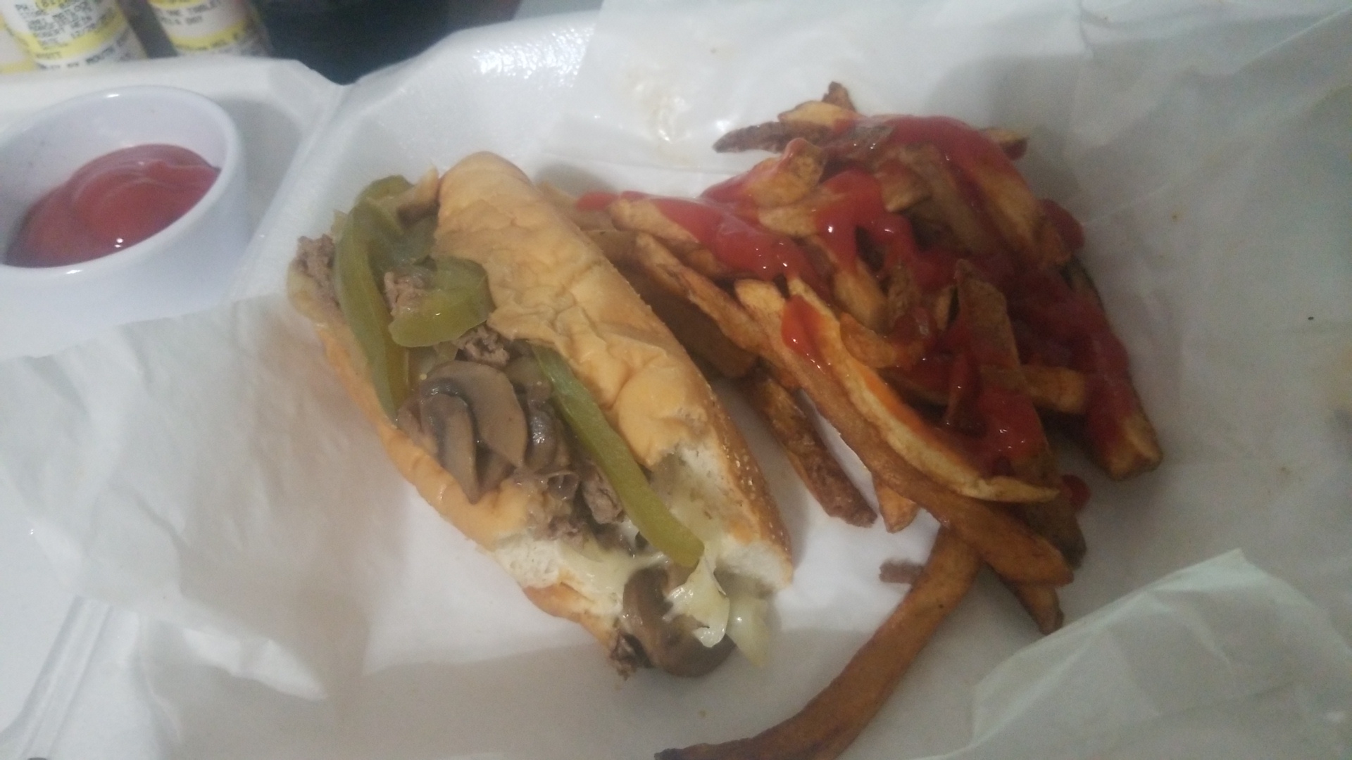 Typically in South Florida the menu price for a similar 12" mushroom/onion Philly is between $10 and $13 with no additional charge for cheese substitutions and free tomatoes, lettuce, banana peppers etc toppings. My 12" mushroom Philly with provelone and tomatoes but without fries or drink before tax was $15.99. Honestly, I was a bit taken by the price. My total price with tax and a tip was $19.71