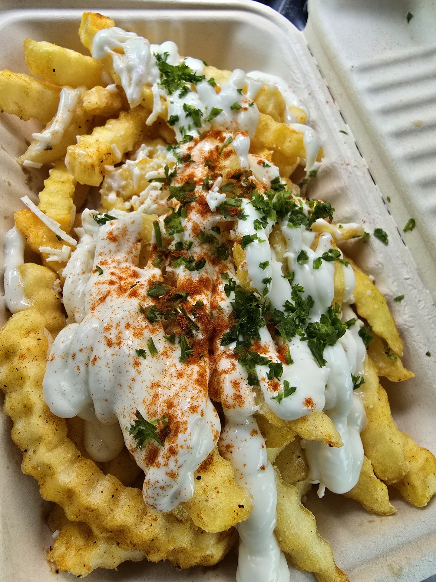 Greek Fries (9/10): Crinkle-cut fries topped with feta cheese, garlic sauce, paprika, parsley, and tzatziki. These were fantastic! The toppings really elevated the flavor, and again, that garlic sauce was the MVP. I’d come back just for these.