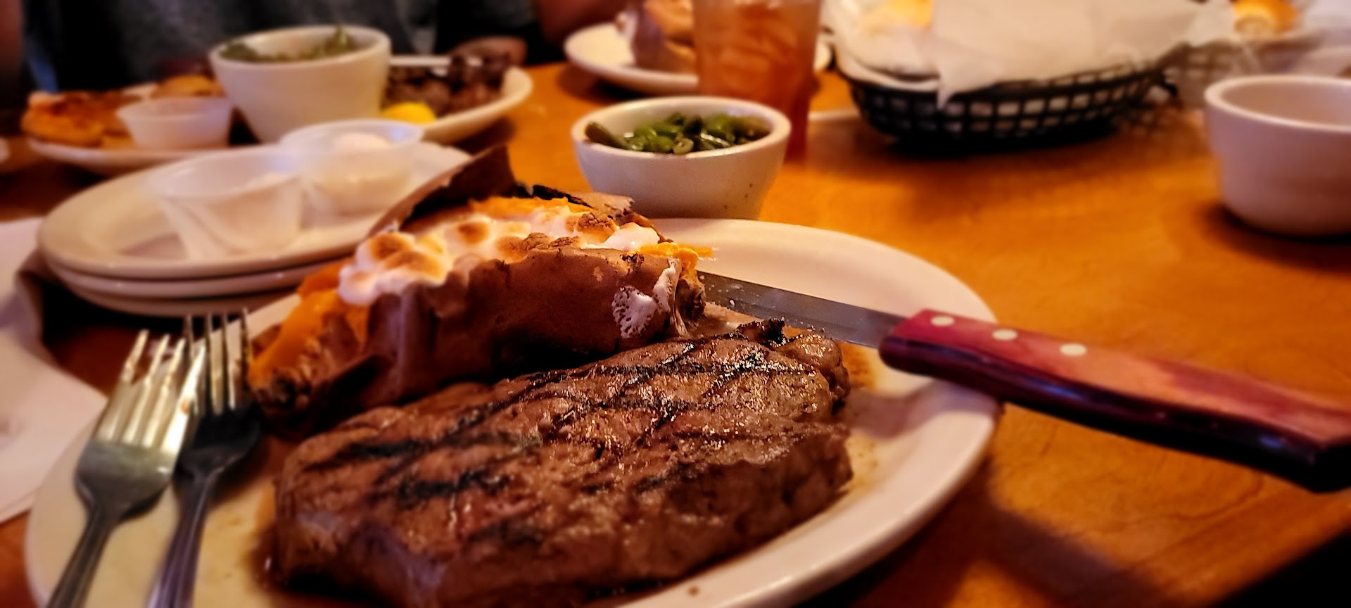 Some tips: They are known for steak, so, I would go with a steak option. Also, the cinnamon butter rolls are delicious, and you can order multiple baskets. You can even ask for a togo order. If you do choose an appetizer, you might want one go with the Bloomin'...