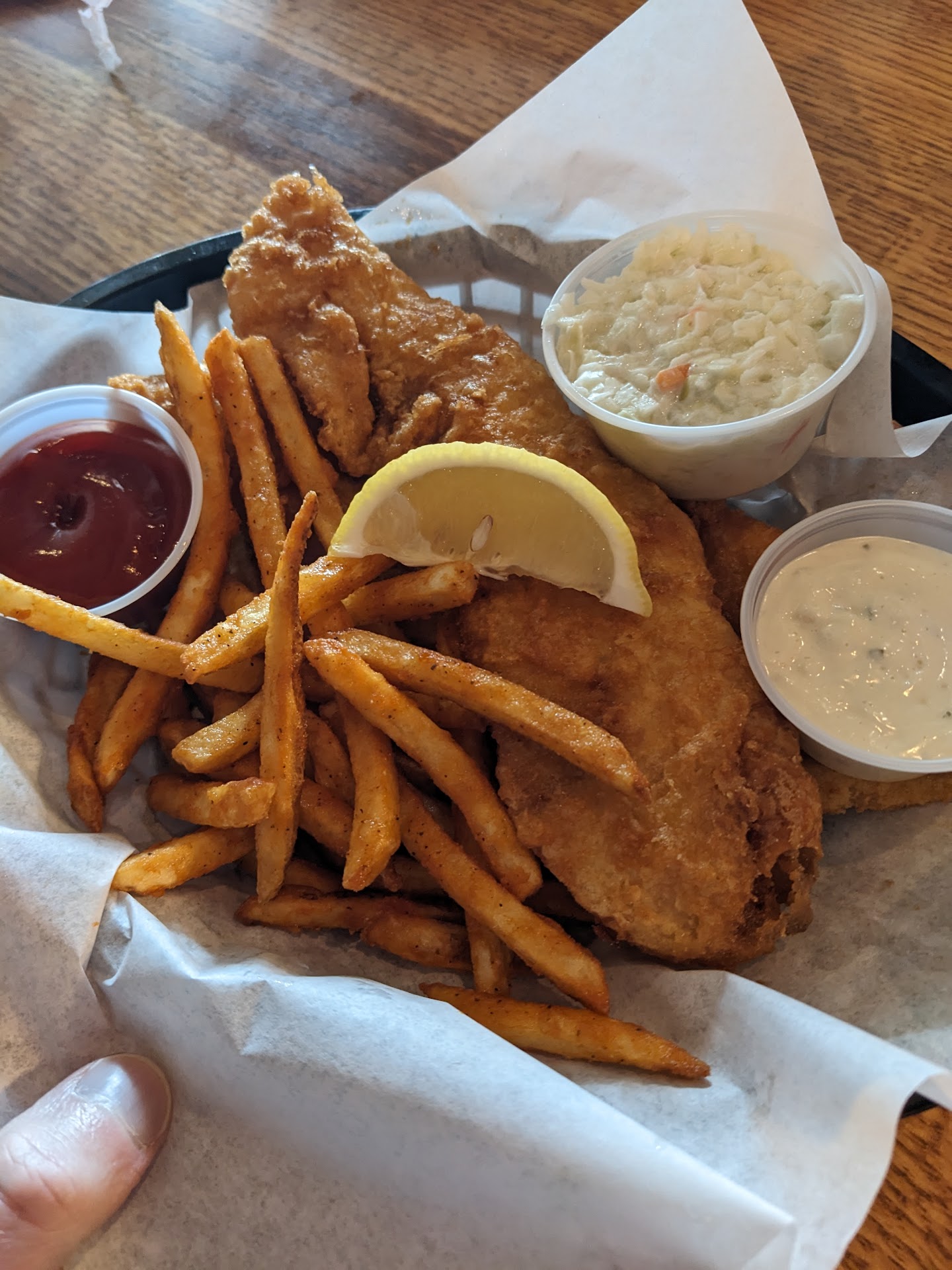 The bartender was very nice, but when you are "short-staffed" in the kitchen you let your customers know. We waited an hour for some fish and steak sandwiches that had all came out cold on top of it. I read the reviews for this place which was okay and we decided to give it a shot, being out of towners. After the first half hour we were over it we even heard other people complaining about the wait and that is when we learned there was only 2 cooks working. When i walked to the bathroom, you can see into the kitchen alley and it was completely disorganized. Not a view you want your customers to see by any means. There were dirty tables EVERYWHERE with no concern to clean them. PERSONALLY, when my kitchen is behind, I jump back and help them because thats your job as a manager. There was absolutely no concern that everything was backed up, no table touches, no visit from a manager checking if everything was okay. I heard the same server say to atleast 3 tables that it would be a minute cause everything was dirty and needed cleaned up even though dining seating was scarce. You couldn't pay me to come back. But then on top of everything, i would never take all of that out on the bartender. UNTIL they did something wrong. Which in MY opinion was coming up to my group and saying, "im pretty sure i forgot to ring some stuff up" as in a way to coerce us to leave big tips. My check was correct, but as a manager i dont believe in stealing from your business for tips is ever appropriate. Its not yours to give away, so for the first time in years i left 10%. Ill never go back there and was so disappointed. But it gave me a lot to focus on at my own restaurant, ...