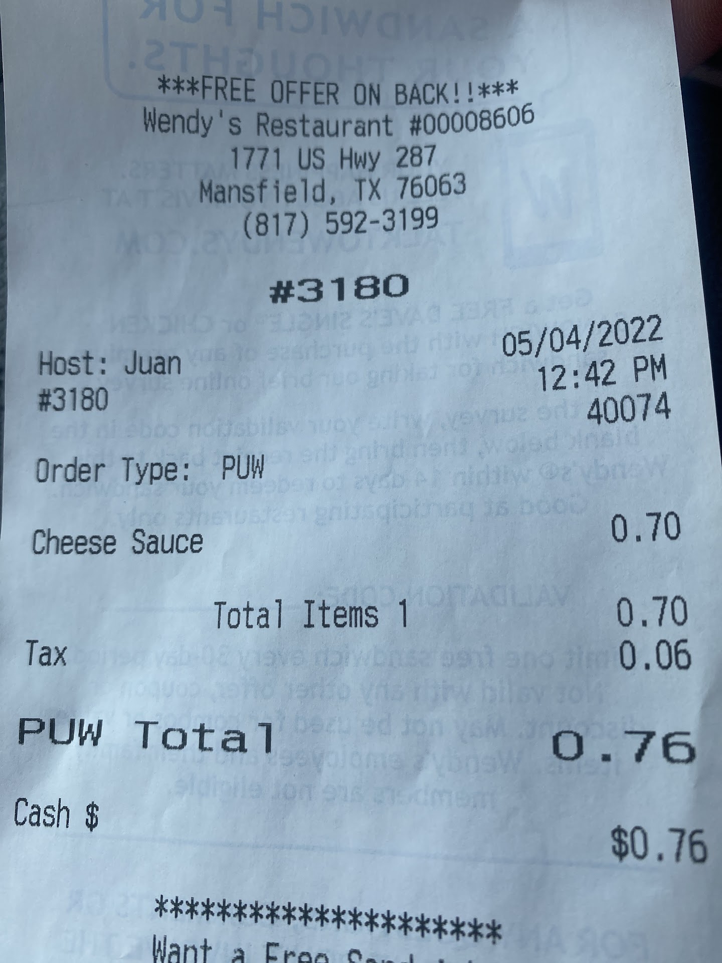 Went to this location today in hopes of getting a great meal before going to my 2nd shift, whichever I was starving and had nothing to eat all day, so I made a quick stop to this Wendy's location. Everything went well until after paying, and the lady handed me my order soon after receiving Mt food and drink I told the lady I didn't order a regular lemonade it was strawberry lemonade which wasn't a big deal however I assume it was the manager who came to the window missing more teeth than the tooth fairy and one one the rudest managers ever especially on this side of town because Mansfield normally have really nice people at the window, however this manager made the situation waaay more than what it was instead of just saying ma'am we thought you ordered a regular flavor lemonade and the strawberry is an uncharged the problem would have been solved but instead he came to the window with an attitude of a giant as tall as he was fir absolutely nothing so I politely asked for my money back and left because if my money isn't appreciated I'll take it were it is. I will never go back to this place again, especially with the attitude this man had clearly not safe...