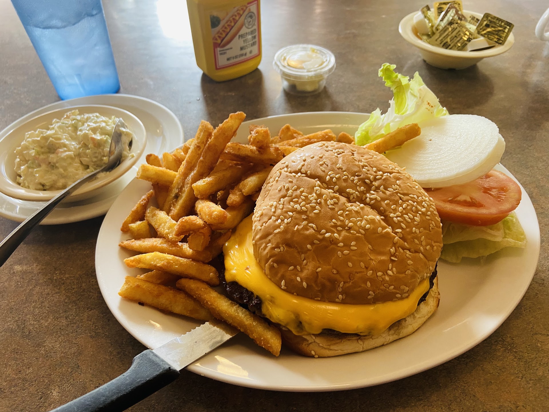 Stopped in for breakfast to go for my wife and I. A young lady Immediately met me at the register and took my order. I ordered two of the "build your own omelet deals with mushroom, tomato, bacon, ham, green pepper and American cheese. We decided on pancakes instead of toast, and a side of bacon each. I stood by the register while I waited for my order to be made, and one of the customers says to me, "Come on over here and have a seat, we're not gonna bite (in jest)!". I thanked them for the invite, but let them know that I needed to go the post office and would return very soon. She bagged up my order very well and made sure that I had everything I needed to enjoy our breakfast. We really enjoyed it and wish I could give them a 4.75 for food instead of a 4. The only reason that I didn't give a 5 for the food, was the American cheese in the omelet seemed to be Velveta, and it was concentrated in the center of my omelet and was just too much. I know for the NEXT TIME to chose another type of cheese, but everything...