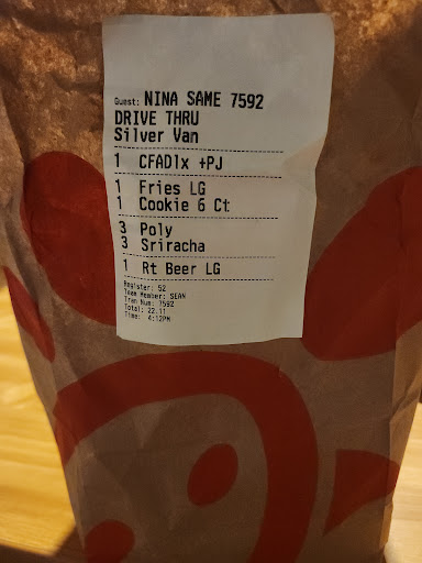 Read moreAbsolutely love chick fillet my grandchildren love I frequent the place .But Sewell Location is absolutely seriously dangerous with the way the line goes into a main road. And after waiting 20 minutes average could be more The order is always messed up then you have to wait again This is a for instance 8 o'clock last night was in the drive thru moved along fairly rapidly I get up to the window waited about 15 minutes at the window there was a car in front of me waiting a little ways up to the girl finally comes over asking after asking my name 5 times and says you mined pulling over there into the parking lot waiting for your food to be done ,I said to her It's only 2 sandwiches and she said there waiting for the filets to get done OK not a problem but as I sat there my vanilla milkshake I could clearly see it sitting there on the window ledge with my name ,but that could've been somebody else with the same name I don't no But the milkshake was clearly made 30 minutes before I got my food that's a bad procedure you can't blame the girls that are running because they are doing a good job and dangerous job but I do think it's poor management in that store sorry to say.. I didn't get no mustard with my sandwich and milkshake that clearly was not even cold at that point and fairly cold outside as I said this isn't the 1st time so I figured I send the little comment I have many more incidents like this cause I frequent that chick fillet check my bag every time to make sure we Have...