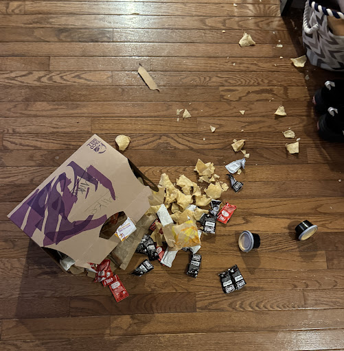 Back to the toilet paper box - this was filled to the top and I mean stuffed with my items. It had to be stapled shut. Sauce packets peeking out the top like zombie's behind the hospital door in that first episode of The Walking Dead. Usually, they will give me a box and bag but someone had the great idea to exceed the weight capacity of the toilet paper box.