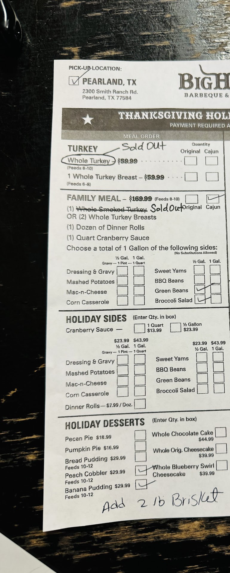 Ā Ā Ā Read moreI would normally have nothing bad to say about Big Horn. Things have been overlooked but this time⦠I canāt ! I placed an order for a Thanksgiving family meal and added 2.5 of brisket to the order. I did so well before the Thanksgiving holiday.