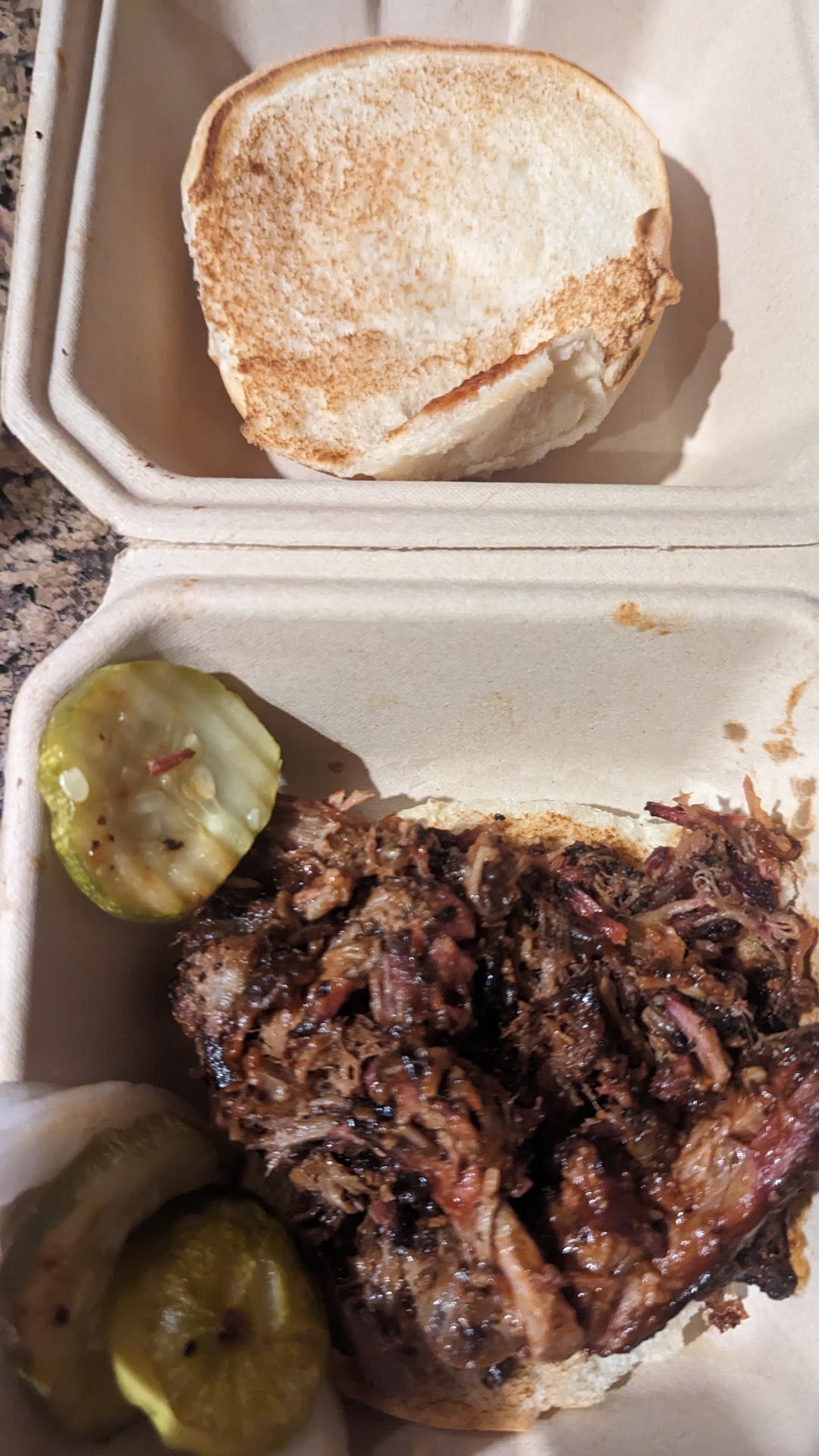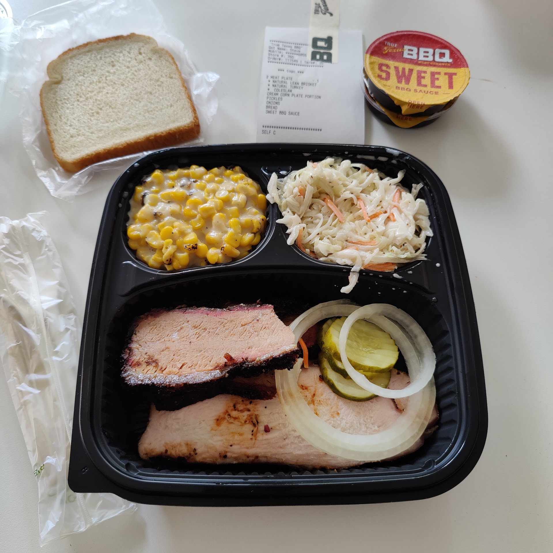 This was my first time eating at one of these and from the road I thought it was an actual restaurant I can sit in to eat. Turns out it's a order either at the kiosks or online, then pick up your food to eat elsewhere. They do have a little patio area with a few tables, see my pictures, but the day I went it was 100° so no. Kiosk experience was not great as I tried five times with two different credit cards but the chip reader on the kiosk would not work. So the only way to pay is to then go inside the H-E-B wait in line at the self-checkout scan my little barbecue receipt and pay there. That was also less than optimal because I grabbed a couple other things while I was in there anyway, and when I hit pay now, the self-checkout hung up. The friendly H-E-B assistant came over and advised me that if you're paying for barbecue you have to do it separate from any other groceries. Then I headed back out and finally got my food. So here's the good part, the food is excellent: Lean brisket-moist, flavorful, just the right smoke, and a perfect bark. Smoked Turkey - I am a smoked turkey freak and this just might be the best I've ever had. Cream Corn - delicious almost gravy like cream, and a nice little bit of char on the kernels Coleslaw - good with just the right amount of moisture, but this is the one thing that was just kind of bland I feel like it needed some seasoning. Sweet BBQ Sauce - not my favorite, to me there was something odd about the flavor, but honestly I'm a bad judge of sauce because if the meat is good - and here the meat is superb - I just don't use sauce. I only tried it for this review and I just dipped bread in it. speaking of bread, they gave two slices but it's just regular white sandwich bread. To me a Texas BBQ needs to be serving Texas toast size slices of bread, preferably fresh made. Excellent place I will definitely go again, I need to try the chopped brisket sandwich and the...