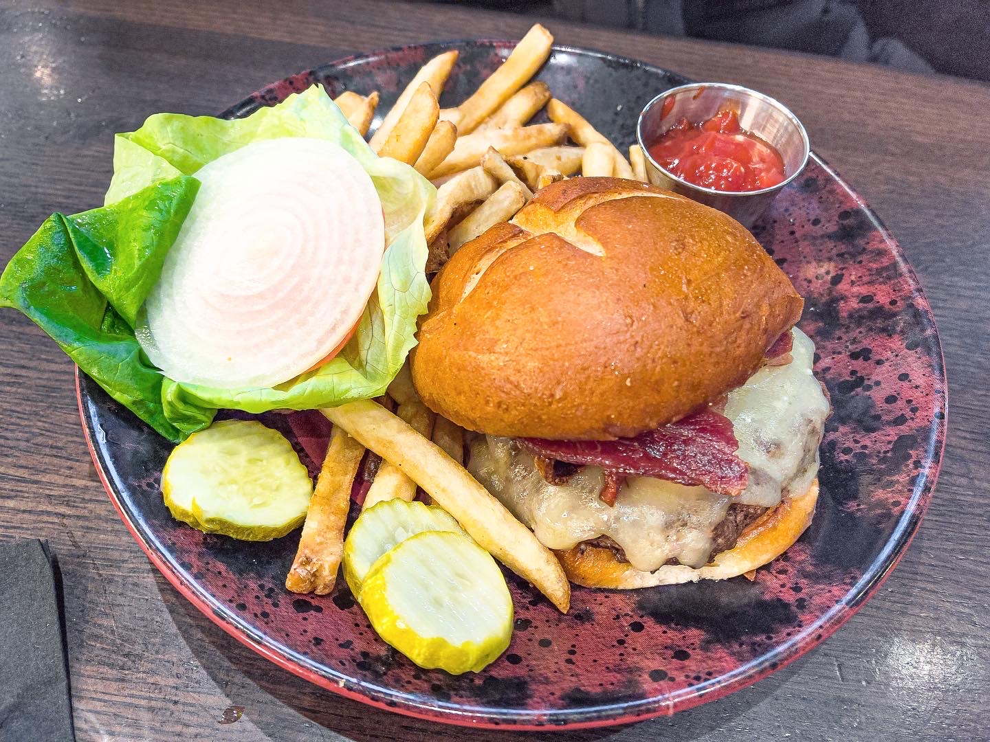 And for the purists, the Plain Jane "1â4 pound signature blend ground beef seasoned with a burger spice blend. Topped with lettuce, tomato and sweet Vidalia onion. Served on griddle toasted pub bun."