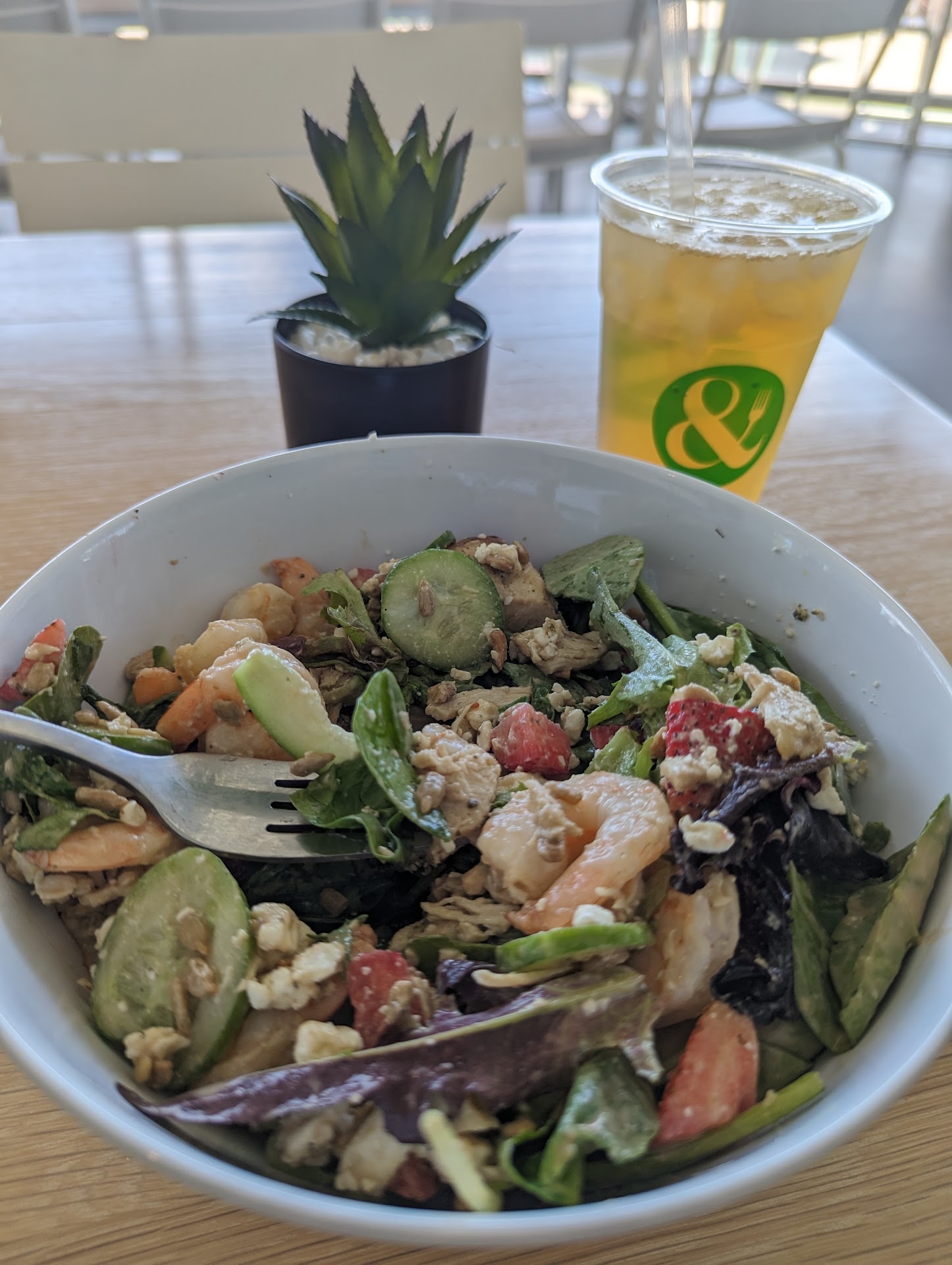 1.) I was asked if I wanted to dine in (I did). My salad was started, but the employee wandered off mid-prep to check their phone and drink a smoothie. When they came back, they forgot the parm crisps.