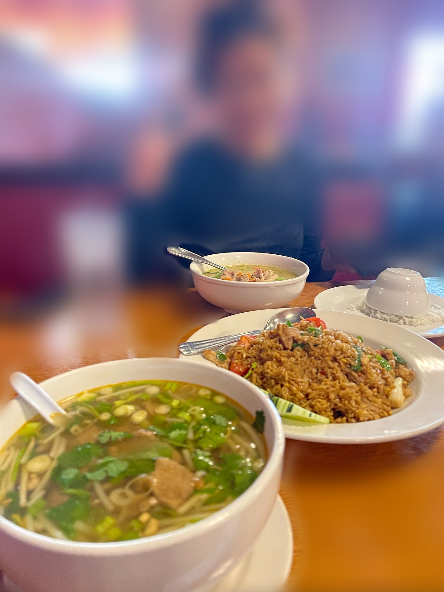 Service: 2/5 customer service was not terrible but almost nonexistent. Got to our table, given iced water and our order taken after we were ready to order. Never came back to check if everything was okay or if anything was amiss. Food: Ordered three dishes. They were pretty plain in all aspects. 1)Noodle Soup (Pho):2/5 Small bowl of pho(a size small in many Asian restaurant) flavor of soup was not deep A few options of meat: vegetarian, chicken, pork, beef and duck. I had beef and it was as pictured and disappointing. No condiments and straight up plain beef. Basically consist of one beef meat part, beef soup, noodles, bean sprouts, green ions and cilantro 2)Thai fried rice(Thai fried rice): 2/5 There were multiple options for the fried rice style and I got Thai which comes straight up with tomatoes and cucumbers as described. I tasted.. sweet soy sauce. There was a strong smell of it. Extremely noticeable. Super oily that doesn’t make the dish any better. 3)Green Curry: 2/5 The flavor again was a miss for me. Flavor was a 3/5 for me. It is on the sweet side. A spice level 4 that did not taste like 4, instead a 2. Chicken was very chunky and uneven. The curry had meat, bell peppers, peas and carrots. Just too plain of a curry in my Thai curry history. Side of rice that came with it was too small. The rice went with a 1/4 of the curry then there was no more rice to go with it. It would be better to have some leftover rice than not enough. —— Cold iced water(tap) had a copper aftertaste to it. Make the whole meal.. even worse.