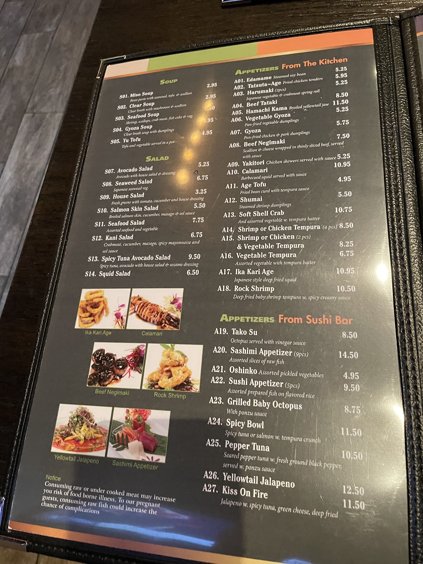 Instead of shrimp tempura I received grilled shrimp in teriyaki sauce and I was unable to eat it as it was so tough. Sashimi app looked and tasted awful. It was cut into four giant pieces rather than eight. I ordered the spicy scallop and it could have been any fish. Way too spicy and no wasabi or ginger.