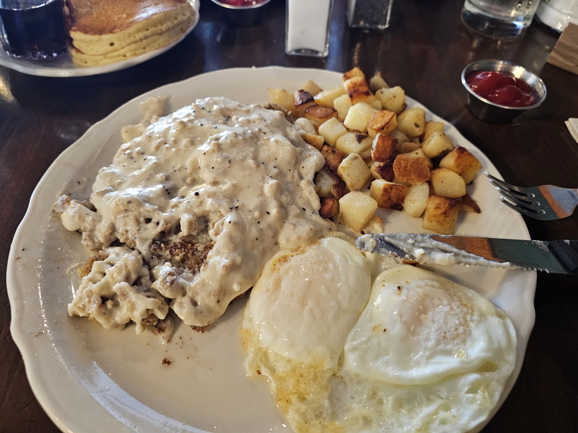 I chose to avoid the biscuits and gravy today. A ham & mild cheddar omelet sounded good. The country-style hash was lukewarm, and ham was lightly scattered throughout the omelet, but with a denser pocket in the center. Both of us were finished about halfway through our respective meals. I can't say today's selections were satisfying for either of us, but we'd both tried something different, so there's that.