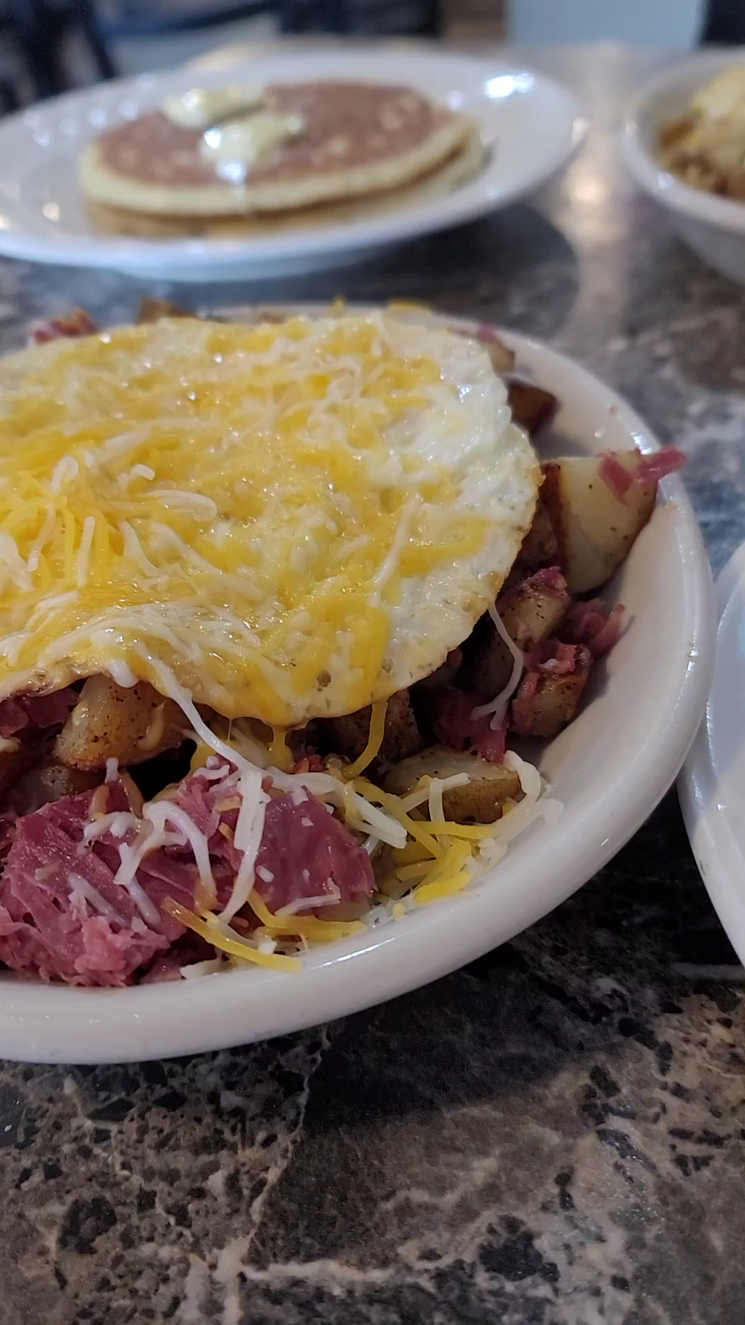 I ordered the corned beef hash skillet. The nice thing about this place as opposed to other restaurants, is that I don't like onions and pretty much everywhere I go, I want to try the corned beef hash, but they always put onions in it. When I ask if they can hold the onions, most of not all, say no, because it's already pre-mixed. But,,,, but ... This place said I could hold the onions, which means it isn't some pre-mixed crap. They used actual thin sliced pieces of real corned beef. There was so much beautiful corned beef in the skillet my bites with cheese, egg and diced potatoes had that corned beef in every bite.