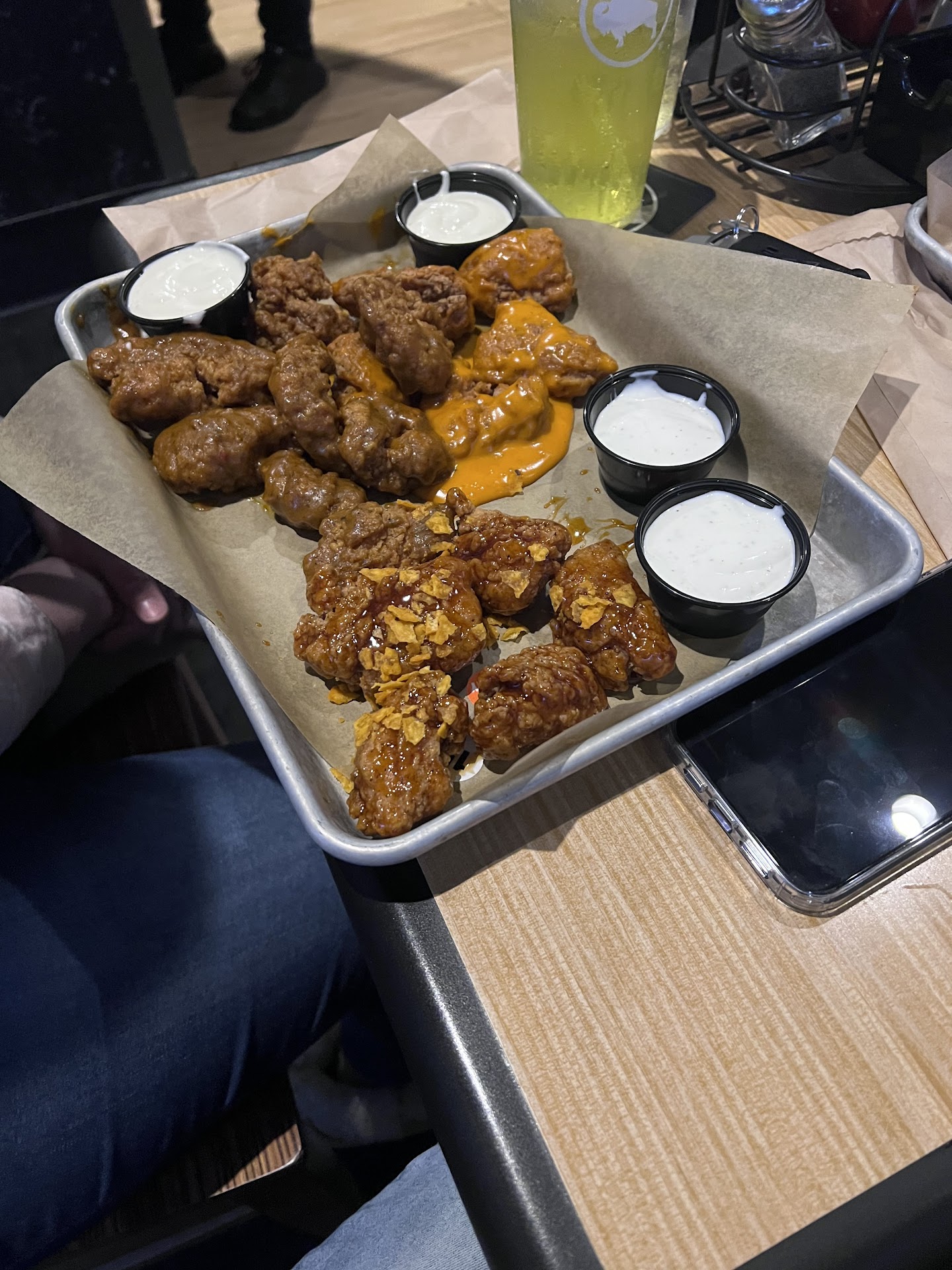 When we got home our order was wrong and had been put in upside down so the whole bottom of the bag was full of wing sauce. The 4 ranches that came with the meal MIGHT have filled a single ramekin if they were combined and the onion rings had clearly been sitting so long that they were near rubber and inedible.