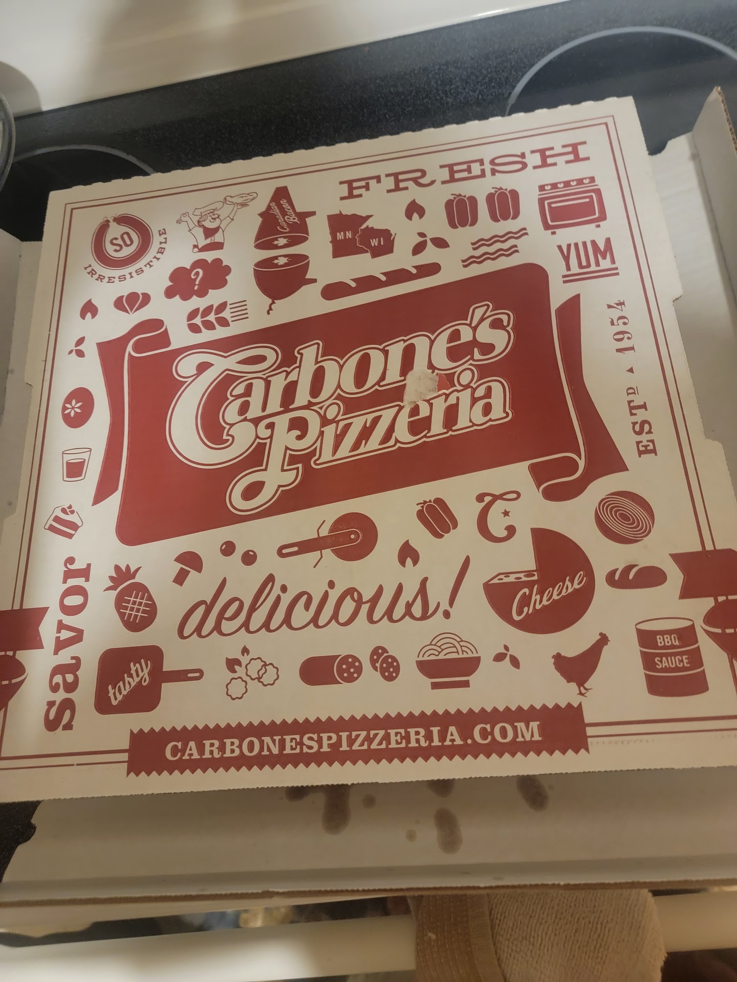 Ā Ā Ā Read moreWe ordered our pizza and when it came it was burned. I called and they told us thats how they are. I worked at a pizza place before and thats Not how they are suppose to be. They told us that they would give us $3 off on the next pizza and if we complained again that they didnt want our business again. That was the owner who said that. The owner is a serious D-bag. Because they are private owners the Carbones company cant do anything. They make the name bad. Go to the one on East 7th street. They use real pizza ovens. They deserve...