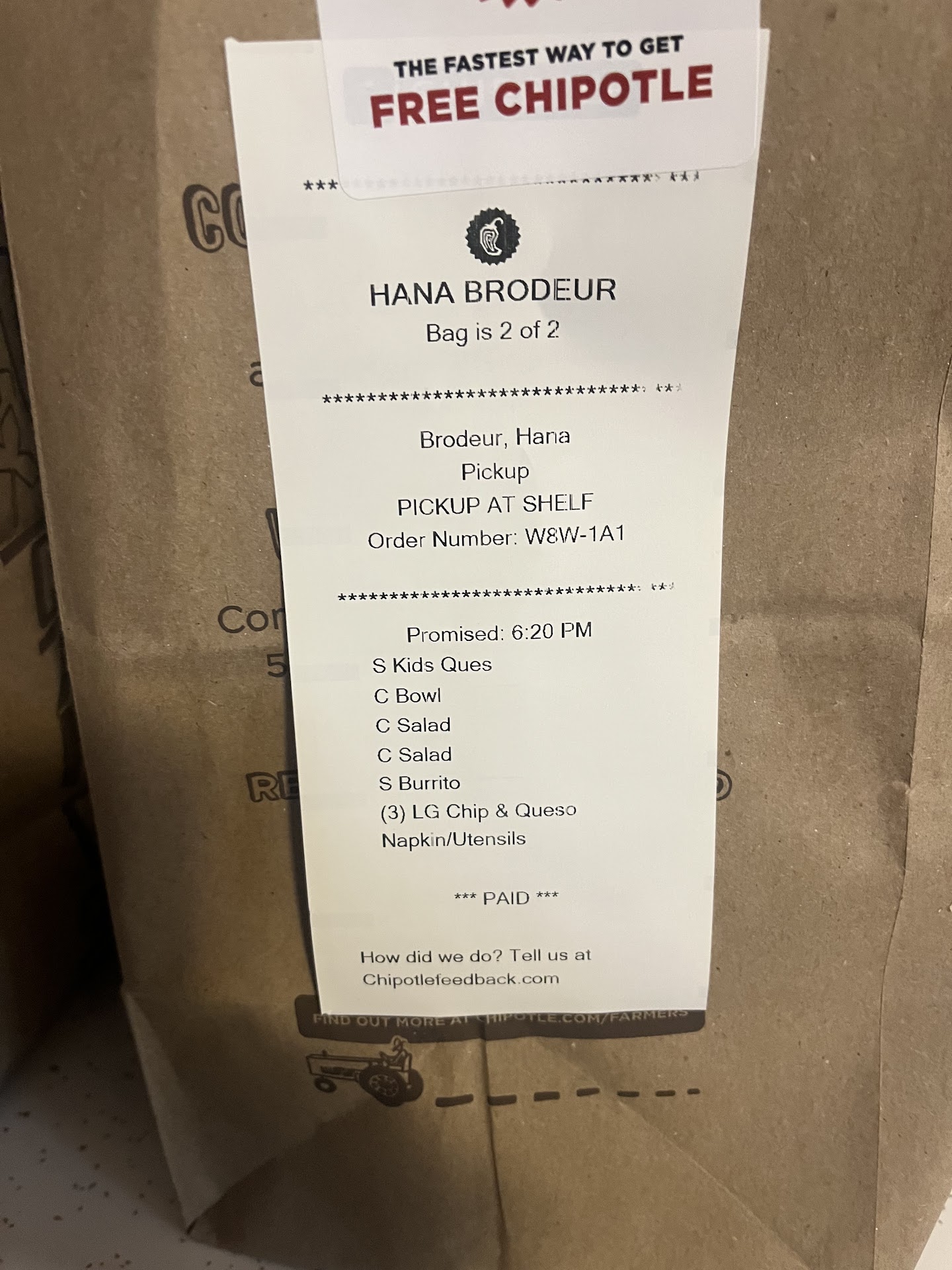 Read moreFor starters yes there is always a line at Chipotle so it was expected when I arrived. The fact that I had to wait over 30 minutes to get my order placed was ridiculous given there wasn't much of a line. Then to have to repeat my burrito order several times is just an example of those who work there not listening when they ask you what you want on it. The staff was very slow with everything they did including the register person wandering around not doing her job. When I paid for my food as soon as she handed me my card back she again took off walking to the back room and I had to wait to ask her for my receipt, which should never happen. Then going to get my drink I come to find out the ice is empty, the pop tops are gone and they are using paper towels from the restroom as napkins. After dealing with all that I go to sit down and EVERY table was a disaster with food all over the tables and chairs along with the floor looking like a parade was held in there. To have 6 employees on shift from what I counted this was absolutely the worst experience I have had there and each time I go it gets worse. I would suggest going to the one located by the mall next time to save yourself time and to get a better dining experience. I honestly can't give this a bad enough review, you had to be there to see the absolute clown show they had going on. You would be better off bringing a burrito shell and making your own burrito with all the scraps left on the tables and chairs and save yourself time and having to explain your order...