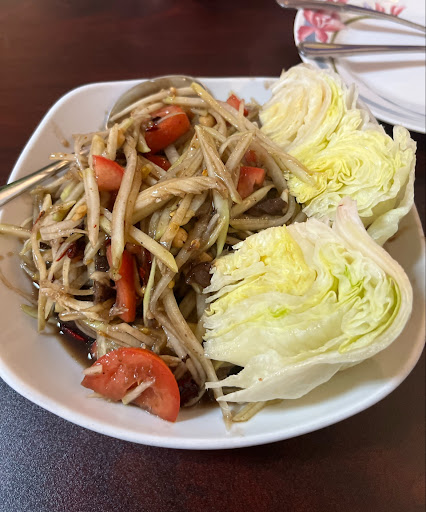 The waiter got to us quite quickly to order our food. And the food got to us quite quickly. The papaya salad is spicey if you let them know you want it spicey. It's one of our favorite dishes and the papaya salad here is great! Would highly recommend the papaya salad here if you love eating it. The boat noodles were good! But if you're a boat noodle enthusiast, this one falls a bit behind but it's still a solid boat noodle that is flavorful but it was just a bit watered down. The amount of noodles you get is more than enough to fill your stomach.