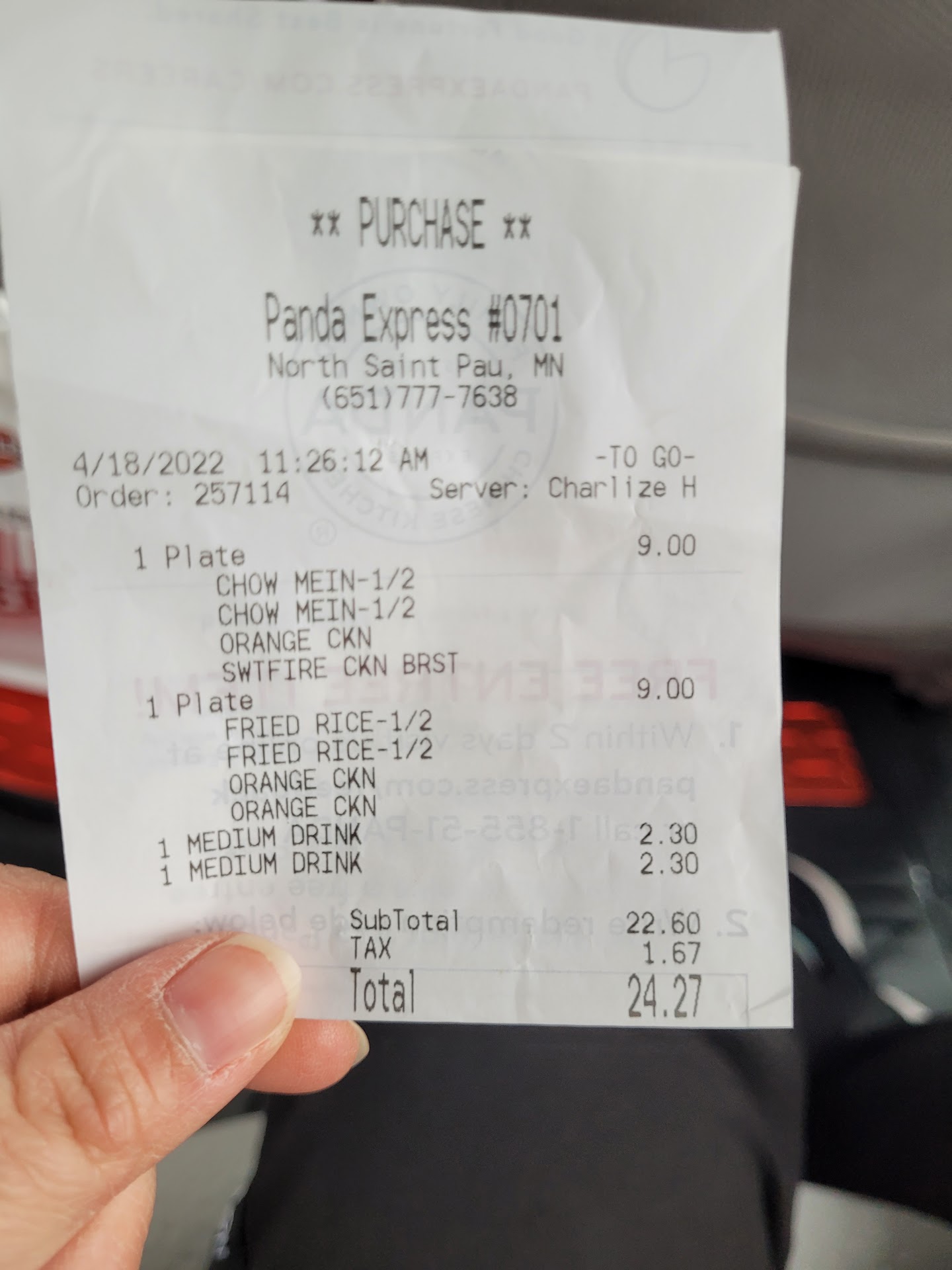Read moreWas told I would have to wait for a certain entree as it was all out. I was pretty hungry, so as I waited for my panda order, I went next door to Slice and ordered a pizza. I waited 15 minutes for my pizza and finished it before I got my panda. I ended up waiting just over 30 minutes to finally get my panda. When my food was finally ready, it seemed as though they forgot about my order, forgetting what I ordered. This seems to be a common issue at this location, I typically avoid this location and go to Roseville or Woodbury. I understand it gets busy, but I just hate having to wait so long...