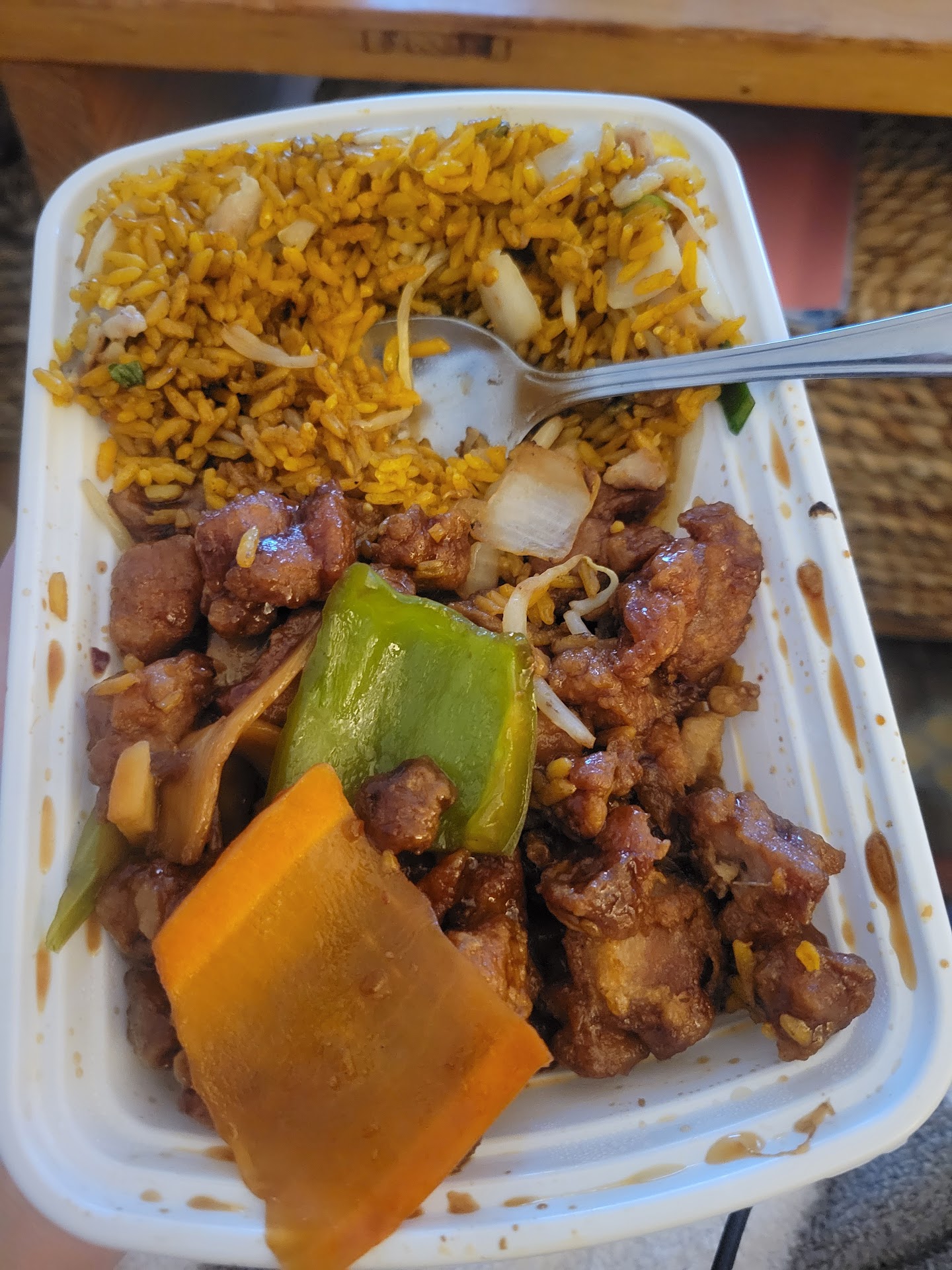 Read moreordered food, they told us it would take an hour. it took an hour and just past another half hour . General Tso chicken, looks good and you bite into it and its crunchy like left over kernels at the bottom of a chicken bag. there was hardly any meat inside, mostly air. When you bit into or open it was like crust hole. Im actually kinda impressed because i have no idea how they did it. the worst thing ive ever put into my mouth ever. lo mien was over boiled noodles and mushy. egg roll was mushy as well. teriyaki chicken appetizers became like a jerky strip that you could never bite into. it was chard/burnt to a crisp. it took my pet 20 minutes to eat a thumb size piece. my pet. let that sink in. 48 dollars wasted. dont waste your money too. the only thing that i enjoyed was my vess sodas. Im posting two pics. one of the chicken to show you its beauty was only skin deep, and the other was the "chicken" that was extra...