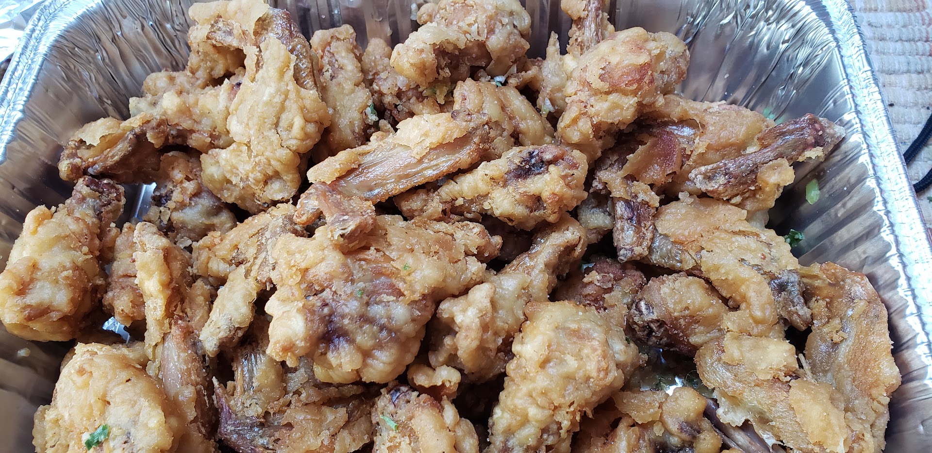 The chicken wings were misshaped like they had been cleaved from mutant chickens and had an odd underlying sourish flavor and fried with a bland crust.