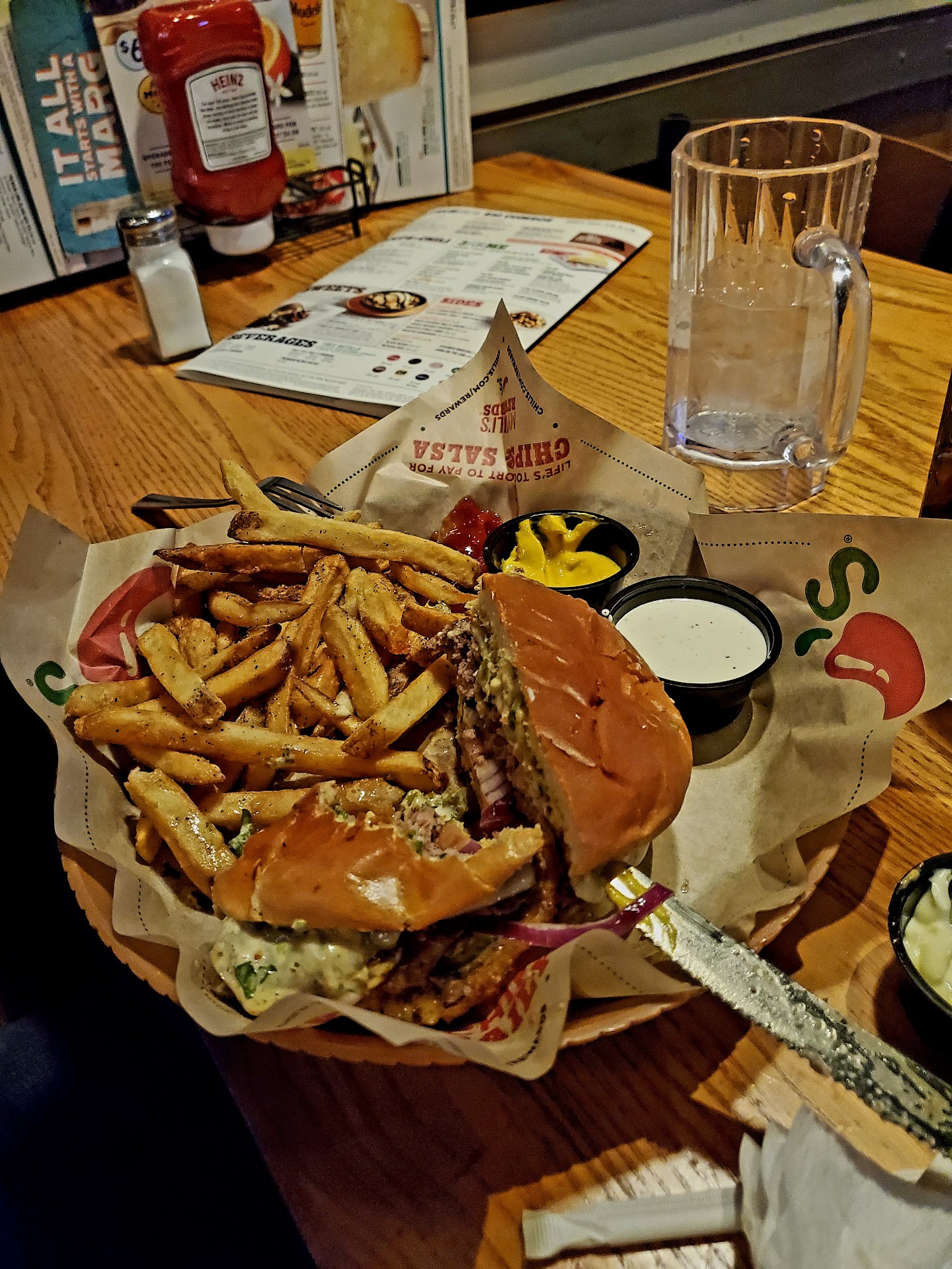 Read moreWhen we arrived there was a note on the door saying that their fryers were down. We decided we would go ahead and have lunch there anyway. It had been a long day on the road and we were hungry. The young man that greeted us asked us if we wanted to sit in the bar area or the restaurant we said we wanted to sit in the restaurant. He said there were no available boots in the restaurant. We could sit in the bar if we wanted a booth. I did see 7 empty booths on the restaurant side. We said fine we would sit in the bar side and he proceeded to see us at a table. Then the waiter hurriedly came over, and took our drink order. He again reiterated that there was nothing available that was fried. We stated that we understood. However, I was a little shocked to find out that any other side we wanted besides french fries was an up charge. I'm thinking as a courtesy to your customers you should offer them almost any side within reason without an up charge since it's not exactly their fault that the fryers were down. We decided that we would have the macaroni and cheese, and the loaded mashed potatoes. The loaded mashed potatoes were literally ice cold. My husband opted to take them home and heat them up however upon hating that they were absolutely flavorless. The burgers were good hence the two star rating. The waiter made us feel very rushed and hurried. It was almost like an "eat it and beat it." We are frequent visitors to the Chili's where we live. But this is one I would...