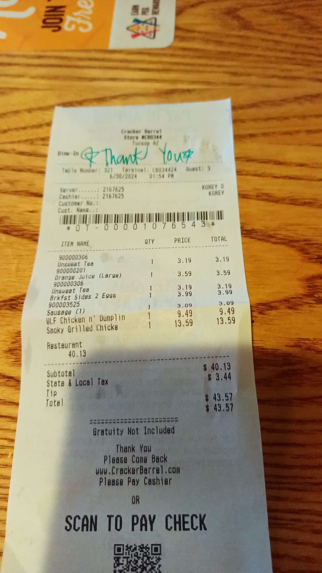 Ā Ā Ā Read moreFelt a sort of way about this Cracker Barrel. Felt like the hostess who seated us was singling us out because I was the only non Caucasian in the building. They sat us in a corner next to emergency door which was so small that our food did not fit on the table. Not sure if the staff was just messing with us to be honest. Our 2 meals came on 6 different plates which did not fit on our table plus our appetizer. Looking around other couples had 4 seaters and there were plenty of seats during our meal. No other table got all sides served on separate plates like we did. Our server was great but couldn't help but feel like I was unwelcome.