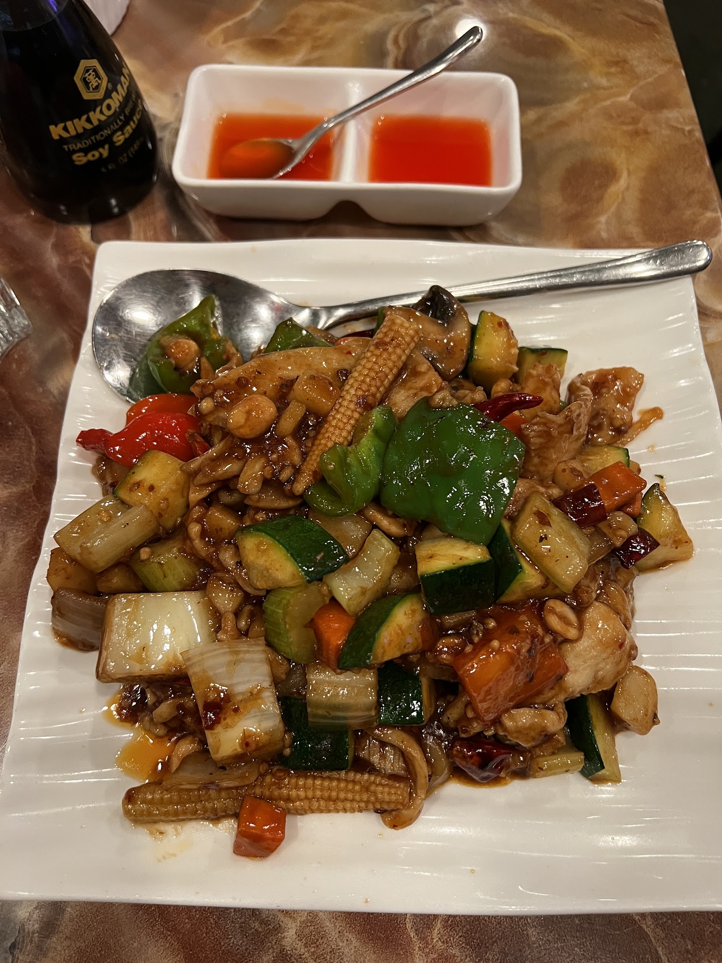 Veggies were crisp and fresh in everything served. Lots of other excellent ingredients too. I wonder how they can do it, as the menu is pretty large. We were a party of 16 which was a challenge I'll bet, but they handled us well. All enjoyed their dinner and the service and special needs were addressed smoothly. I had Ginger Chicken, and it was very good.
