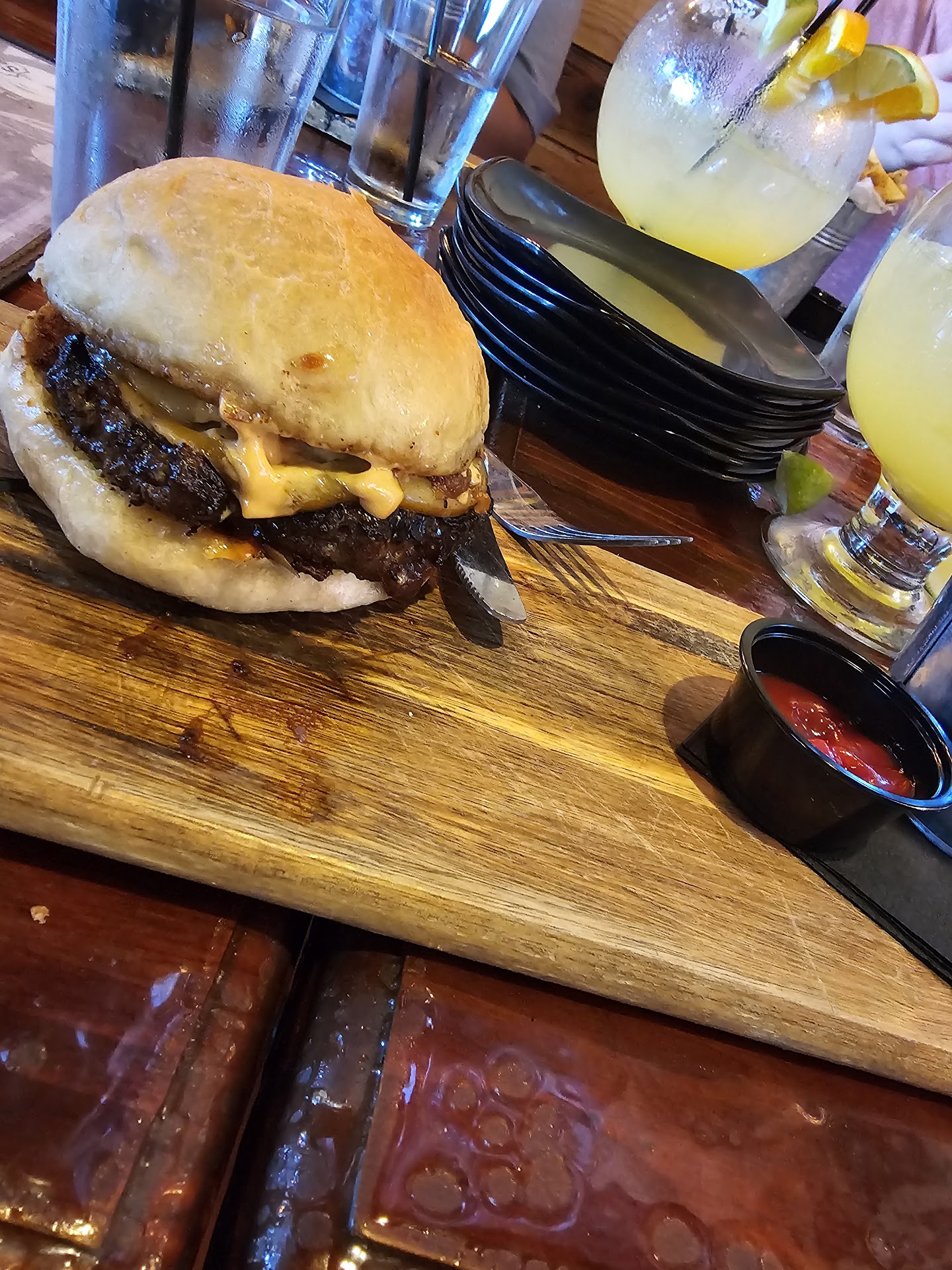 Read moreVisited on a Sunday afternoon. We were promptly greeted. The decor is cute, but the majority of the tables are tall bar tables and the chairs are not comfortable at all— even at 6’2” my son’s feet didn’t touch the ground and the spot to rest your feet is awkward. We were greeted by our server promptly and water was always full. The menu had a lot to choose from. We opted for burgers and appetizers. The “goons” (mushrooms) had a nice batter that was crispy, however biting into the mushroom it was like a bunch of mushroom water with no other real flavor. It was a good amount, but I didn’t really want to finish the mushroom water bombs. The onion rings were TOP NOTCH! Definitely made in house. The batter was crispy and had great flavor. The onion rings were thick cut and held up very well! Even the onions had great flavor! These were hands down the star of the show! Our burgers arrived without any option for level of done-ness. The side salad was a plate of romaine lettuce with some powdered Parmesan. I was not impressed with the salad, I felt like a rabbit. The ranch dressing was either made in house or at least not from a powder mix with water. It was a good ranch dressing! The burger was very thick! The bun held up well to the level of condiments and extras. The burger had nice seasoning. It tasted good enough, but the texture reminded me of the bricked/frozen patties. The veggies on the burger were fresh and good quality! The overall atmosphere was missing something. There was just this flat affect from the servers/hosts. They did what they needed to but there was no joy or interaction. To me the food was probably a B and I was really looking for the service to kick it over the top and earn an A rating. I had a better conversation with the wall I was sitting near than any of the staff. Thankfully the rest of my group...