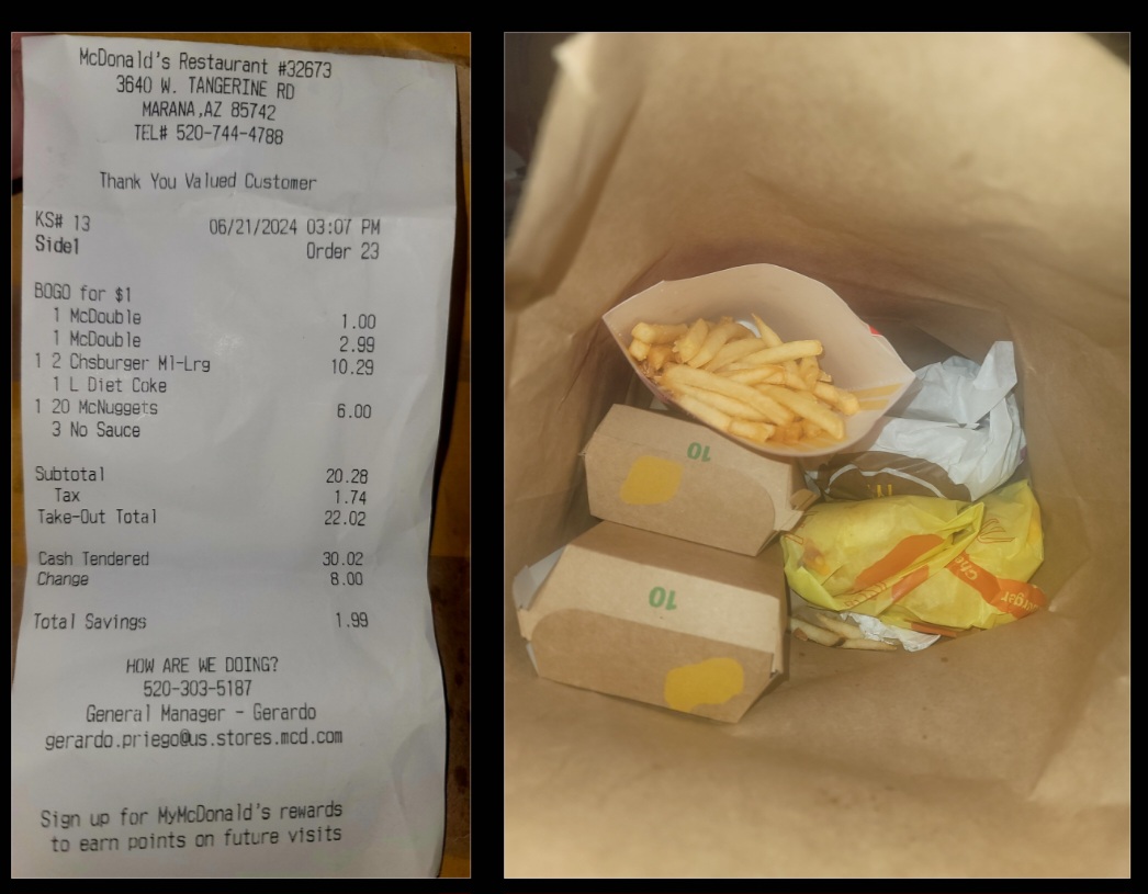 Read moreUpdate Dec 2024 We tried again. Food hot, delicious, given with a friendly smile. Stars increased. Summer 2024 After going through drive-thru and making a long drive home to get my order, I saw that 1 McDouble was missing. I called the receipt number and was only able to leave a message. I looked up the store number thinking I could let them know a McDouble was missing expecting a nice calm I'll make a note so you can come get it on another day. I was grateful they answered and gave receipt info of what happened. Instead of a kind response I was surprised to get a snarky flippant voice saying, "I remember that order and I never make mistakes!" I asked who am I speaking to and was told N _ _ _ _ . I asked for a manager and she said she was the manager on duty. I said, "Why are you speaking to me in that tone?" She said she just had another customer get in her face. I told her I'm sorry that happened, but I did not do anything to her. She continued to be aggressive and abrupt telling me that I could come back to get 1 McDouble that if another manager was there they might give me something else. I never asked for anything else. This seemed like she was accusing me of trying to get something else and that my claim was untrue. She never recovered her ability to respond with kindness and never apologized. We ended our chat with me apologizing to her for having a bad experience with previous customers. I think N _ _ _ _ cares about her job but she is in need of deescalation role-playing skills practice in dealing with common customer service encounters. She was not kind, courteous or friendly. I can't imagine what it would be like to work with her, and it would be no fun if she were manager in charge. She is not a good role model and does not have problem...
