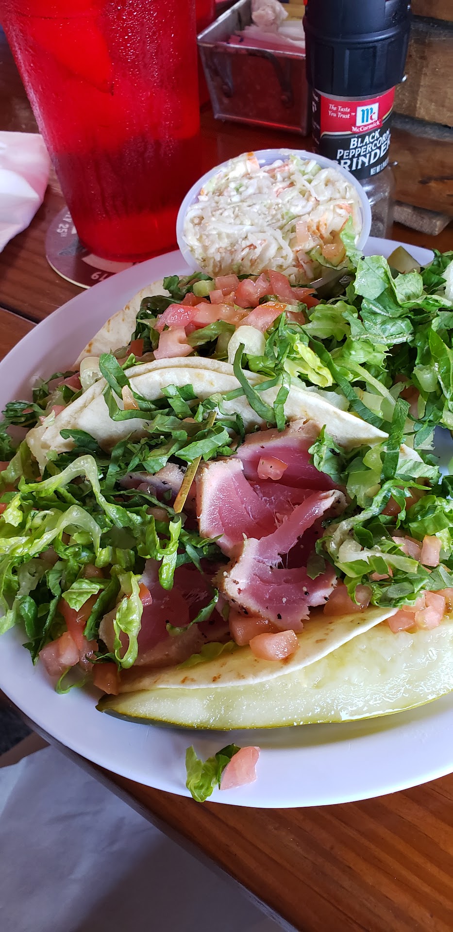Tuna Tacos - were AMAZING! Tuna was cooked perfectly and served on flour tortillas with sliced avacados, wasabi sauce, lettuce and tomatoes. The spice of the wasabi sauce was perfectly balanced with the cool taste of the avocado. As I'm writing this my mouth is starting to crave these 🤤. My only complaint, is there was way too much lettuce on the tacos (as you can see from the picture). The tacos came with a side and the coleslaw was good.