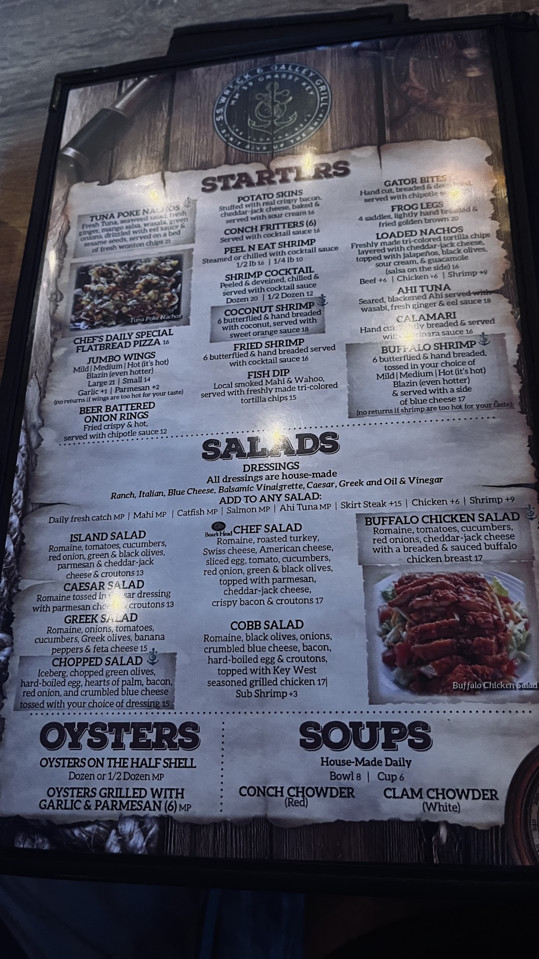 Read moreFour of us stopped here on our way back from Key West around 1:00pm. First off they were out of several draft beer choices and the waitress (English accent) told us it was happy hour from 11 to 3....and then came back to correct herself that it was really from 3 to 6 so we were out of luck. Found prices to be on the high side for a place on the road side with no water views . Ordered the taco special and since it didn't come with any sides we asked her to point out a list of sides on the menu..which she did. She pointed to a list of sides priced at $4.99. Both couples chose a side of onion rings to share. They arrived in a basket...the good large portion surprised us. The food was good...chicken was a little over done and the fish over salted ...but good. When we got the bill ...we were charged $12 for the onion rings listed on the bill as an entree! When she came back to the table we questioned the price and she blatantly ignored us and began to process the first bill. She said the side order is only 3 or 4 rings(for $5????) and since we were sharing between two people she assumed we wanted a larger portion! YOU POINTED TO THE SIDES ON THE MENU FOR US!!!! As I continued to say that wasn't acceptable she continued to process our bill. I continued to protest that she pointed to the sides on the menu and knew very well what we wanted. The price difference of $5 to $12 is significant. She laughed it off and said ...yes true....I guess it's a learning experience for her! 😳 My husband and I shared the taco special...so if SHE decided THAT portion was too small and ordered 2 instead....I should have to pay for it???? So unfortunately her tip was $6 short of what we would have left. My apologies to the rest of the staff... If you are traveling south..keep going to the Island Fish Company...