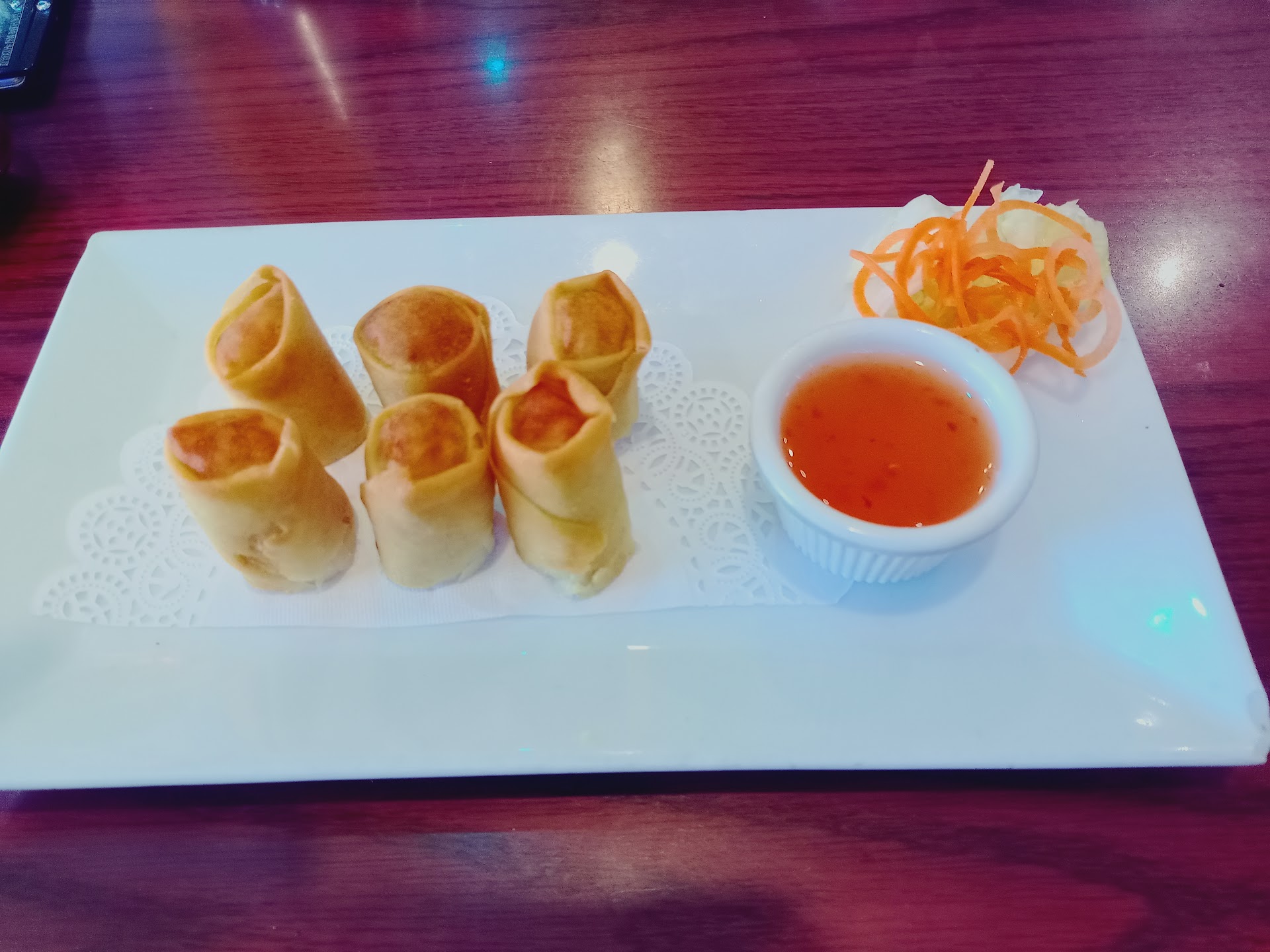 Read moreWe were in the mood for something a little different, this was sure different just not what we expected. The waiter seemed to be over anxious to take our orders but that is minor. He took our drink orders as we were sitting down. Our two unsweetened iced teas came out s sweet tea and he spilled our beer. Luckily the beer was contained to his tray and he did replace our teas. We ordered appetizers, two seaweed salads which they were out of. We substituted with a miso soup and a bowl of edamame, the soup was very good the edamamae was okay. Our chicken appetizer came out shortly after and was uncooked in the middle. The waiter appeared annoyed and took it back to try again. When it came back it was just okay. The calamari appetizer was very heavily battered but still good. When we ordered our meals he seemed like he might be new and was not of much help. I asked him for a recommendation on a meat to go with my dish he suggested duck or beef I asked for duck. My meal came out first and was with beef, he argued with us and took it back. The other two meals came out, one person had a roast duck dinner which was very good and the other person had a mixed seafood pad Thai. Being his and my first Thai experience we have nothing to compare it to but it was okay, not great just okay. After a long wait my meal finally came out. I bit into an end piece of the duck and it was pretty good. My brother tried a middle piece and spit it out immediately, it was still frozen! We started to look at it and all but the two end pieces were frozen. Rock hard ice cold frozen. We were disgusted and asked for the bill. We will never go back and left feeling very disgusted. Poor sloppy service with uncooked food, we will never be going...