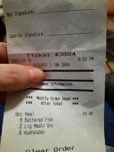 Read moreTo start I have worked in a kfc/tacobell before.. First off I'm going to say the food was great exactly like it always is... But the Customer service was lacking. I ordered my food at 6:36 ... I asked for a family fish meal with double mash patatos and gravy Then I tried to order a 4 peice chicken meal I asked for all thighs.. the guy said he couldn't do all thighs he had to many chicken bucket going out... ok fine cancel the 4 peice... I get to the window the guy in the blue shirt takes my card then hands it back i ask for my receipt... about 2mins later comes back to the window and try to get me to pay for a different order I said nope I had the fish meal and I asked for my receipt again he said hang on... comes back to the window and ask me to pull around my orders not dun and he himself will bring out my receipt... I pull around and sit a nice lady walks out gives me my food and I ask for my receipt.. she walks back in and comes back with a peice of paper that's not my receipt and not what I was charged... I said I need my receipt, she then tells me that Scott who I find out is the gm lost/ or can't reprint my receipt... I have never had this problem before and service was subpar but food was good as always... I will be calling my bank to make sure what was charged... The lady that brought me my food was really nice she said if I walked in the store that he would haft to find receipt but I didn't have time I got my food at 7pm I had been there long enough.. *The receipt I received was for a canceled order mine however was not canceled I...