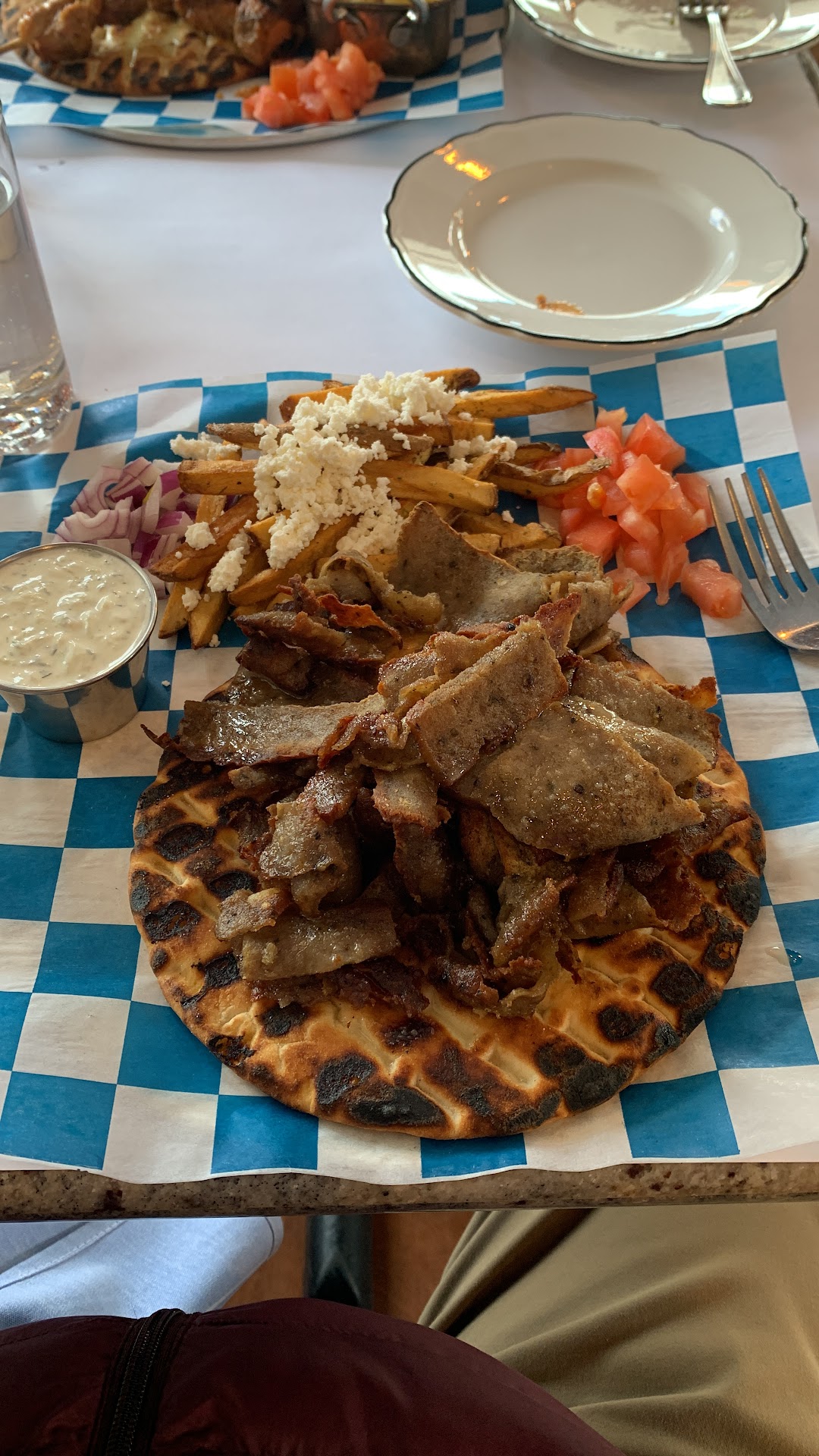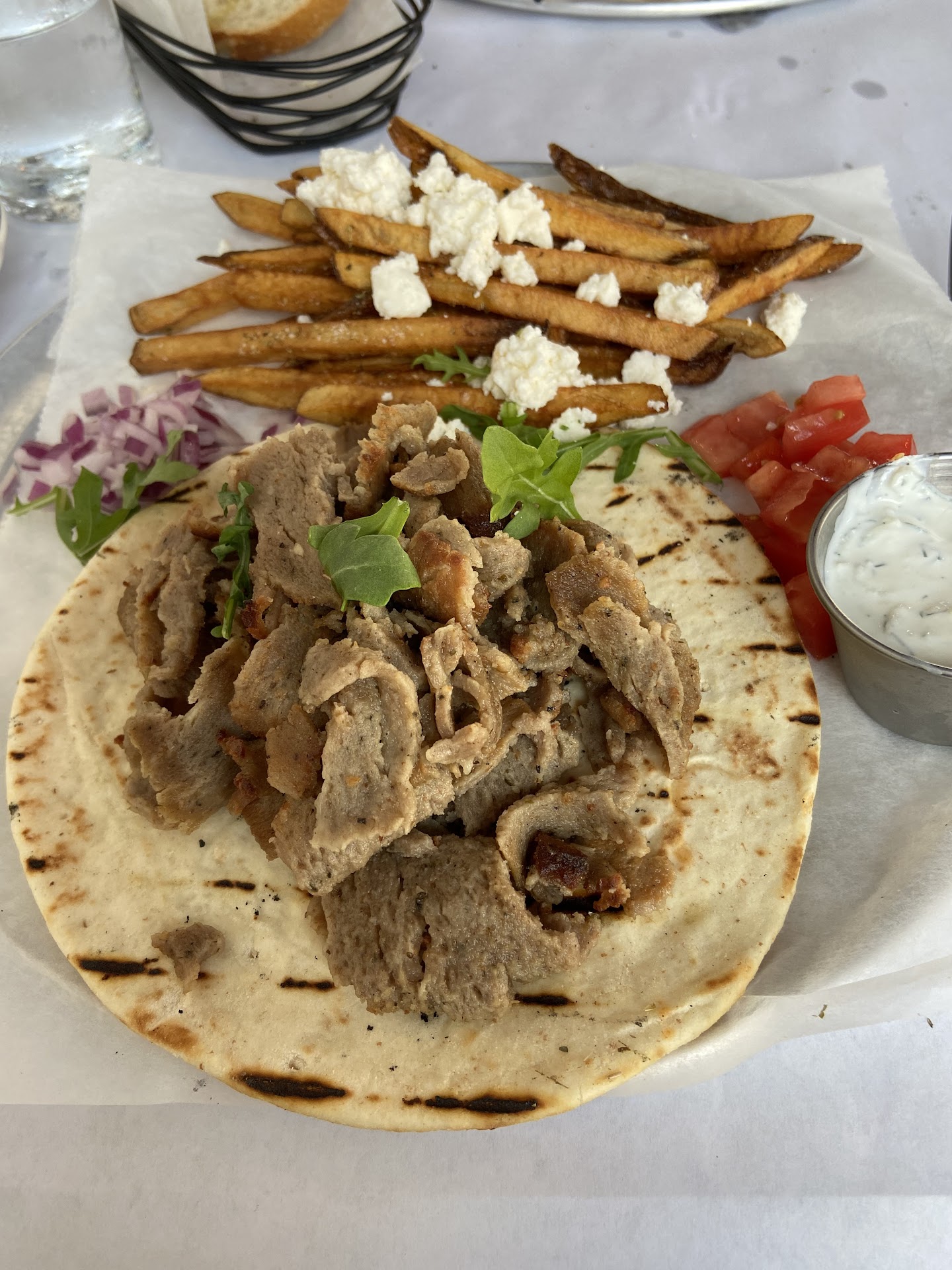 The Gyro Carvings were also served on a warm pita, but it was burnt on one side and rather tough. The meat was very dry and tough with some pieces resembling bacon because it was so crispy. Gyro meat is never served this way! The tzatziki sauce was the only way to be able to eat the meat. The Greek fries were alright.