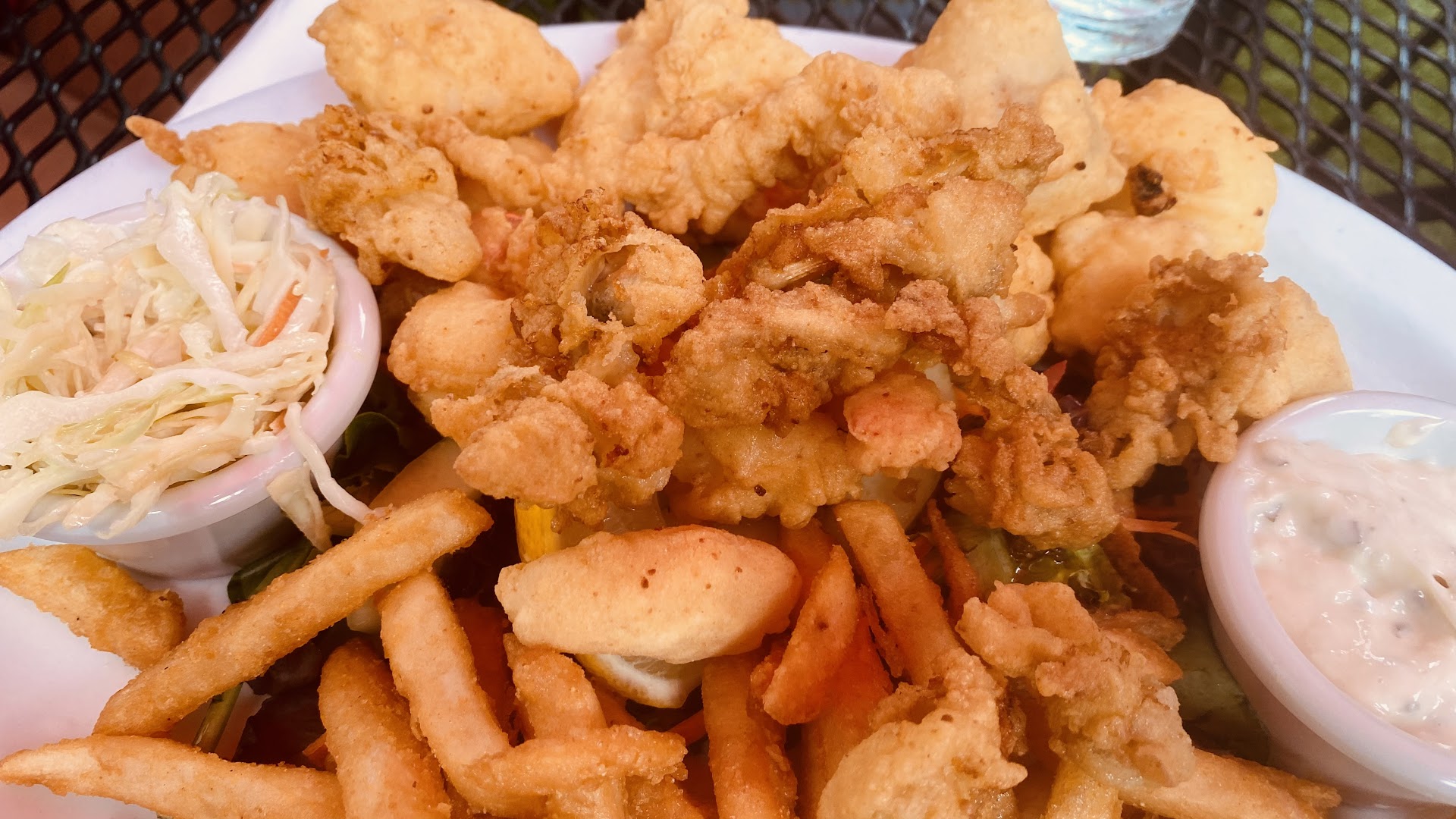 Fisherman's Platter with fries & cole slaw over a small amount of mixed greens salad. A fair portion of lightly battered and fried shrimp, scallops, haddock nuggets and clams. The batter was so light so it wasn't a heavy fried meal. Cole slaw was fresh but a little tasteless. Fries were crispy. I had read the reviews of people disliking the hot seafood over the cold salad so quickly at the salad first.
