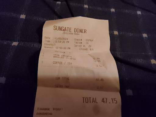Good Evening Google Family. Mom and I visited today on this Thankful Thursday, October 3, 2024. I had just left the Walmart in Eddystone, PA, this has become my favorite location of Walmart, because they always have everything on my shopping list. I then shopped for gas at Conoco, and then the post office in Woodlyn. I used to patronize this location, but I have not been there in years, the post office in Woodlyn. I needed to send my cousin a wedding present, since she is getting married soon. Our next stop was the Sungate Diner. Mom and I have never patronized this diner. I look for diners that have tilapia and I have long discovered that not everyone carries tilapia. If a restaurant does not have tilapia, then Mom does not know what else to eat. We visited the rest room and it was clean. Amanda was our server. We started out with someone else and then it was Amanda. Amanda was always our server. She was superb. My mom ordered tilapia with mashed potatoes and no gravy, and applesauce. I ordered crab imperial, stirfry vegetables and corn. Everything was delicious. Mom took her leftovers home. I ate all of my food. I was super hungry. Afterwards, Amanda informed me that I could pull around the back so that Mom could get in. I thought that was so sweet. Amanda will always be our server when we come here. She also said to call ahead and they would open the back for my mom. We felt like CELEBRITIES!!! We will definitely be back here, A truly delightful experience!!! Its hard to find people like Amanda, not everyone is kind like her. Thank you so much Amanda and we will return!!!! Crab imperial was $22.99 and broiled tilapia was $18.99. I also had tea, which was $2.50. Our grand...
