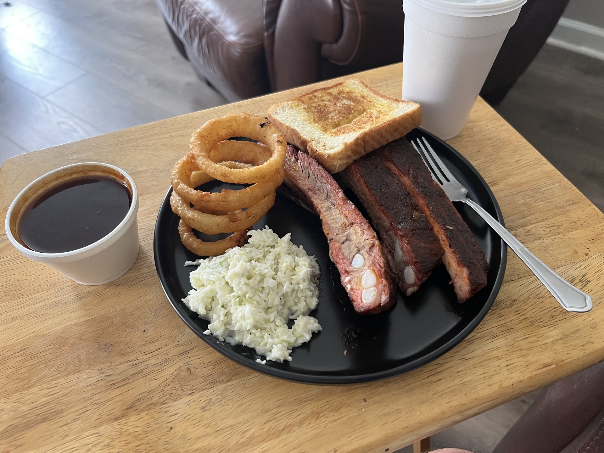 Read moreCaution! Delicious food coma ahead! This place was exactly what we have been looking for. We got food for 4 and had more than enough! The ribs were exactly what you expect from an awesome bbq spot! The tea was on point and the sides did not disappoint. We had friendly service and they even let us sample something to make sure we would be happy with our choice! If you want good bbq this is a wonderful spot. Dine in area is small, but it matches the feel of the place, and I wouldn’t want it any bigger. Prices were great and I’m including the recent menu so you don’t have to stand around for an hour figuring it out… cause once you smell it you want to try everything! We got our sauce on the side and I would recommend that since everything tastes so good even without it. Not to say it wasn’t amazing, but I don’t like too much sauce on my ribs. Onion rings and slaw were excellent choices, and the banana pudding will leave...