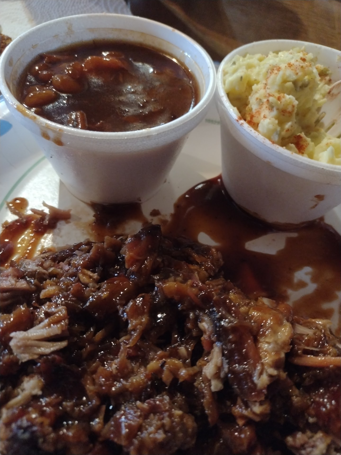 Read moreI like to say that I like a little BBQ with my sauce but this was absolutely swimming in sauce. Also I love anything sweet but this BBQ sauce was overwhelmingly sweet. The "smoked" beans seemed to be also strongly flavored with the same BBQ sauce. Potato salad seemed like homemade but had a strange sour aftertaste. The toasted bread was the best part of the meal. I was not greeted when I came in, actually felt like I was putting out the two employees who had to get up from a table and put their phones down long enough to fix me a plate and take my money. A person who I assume is an owner came in while I was eating and also never addressed me; no one ever asked if my meal was okay or if I needed anything. Possibly because although there are three tables they aren't used to anyone actually dining in? I did get a half smile from the register girl as I was leaving and was offered a lid for my to go cup. I would give a pass for the staff if the food had been better but this place is a...