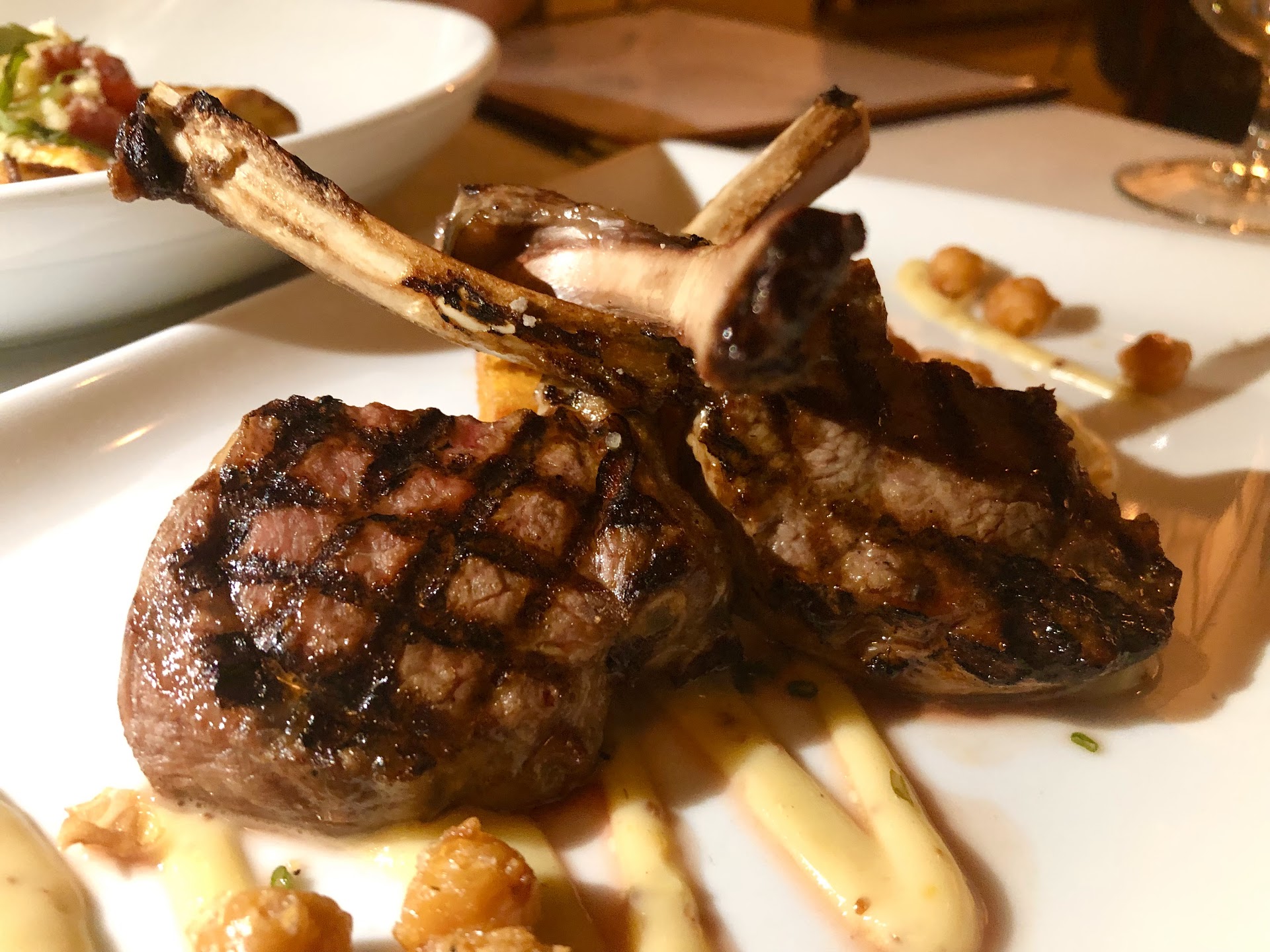 Read moreYears ago we went here during the AC Restaurant Week, and enjoyed it back then. So after a long while trying to get a reservation, we finally got one online. My daughter and I had already looked over the menu before we arrived so we knew what we wanted. We were sad to see that the restaurant had lost most of its bay view due to condo looking structure being built across the street. We ordered for an appetizer to be shared by all three of us: Lamb Lollichops, Eggplant Rollitini and the Beet & Goat Cheese Salad. All were excellent in flavor. My SIL ordered the double apple cheddar stuffed pork chop and a side baked potato with butter. It comes with mashed sweet potatoes however he had them place it on a separate plate for my daughter and I to share. We felt it was too sweet with the added sweetness. My daughter ordered the filet and mashed potatoes. I ordered the duck with creamed corn, cornbread stuffing and blueberry sauce. My daughter and I shared our meals so we were able to enjoy both meals. The filet was cooked perfectly however it was still on the dry side. The duck had a crispy skin and the it went well with the blueberry sauce. My daughter and I both enjoyed everything that came with the duck. Service was very slow, however, the waiter had a lot of tables he was taking care of. We were seated in the back of the restaurant under a painting of Frank Sinatra. For dessert my SIL ordered the Creme Brûlée which I could see he enjoyed very much. Both my daughter and I ordered the chocolate peanut butter pie. The pie was creamy and rich. All three desserts came with whipped cream on the side. This restaurant had a more refined clientele, as it wasn’t boisterously loud like one I reviewed last week. The food was great for the most part. We will be back...