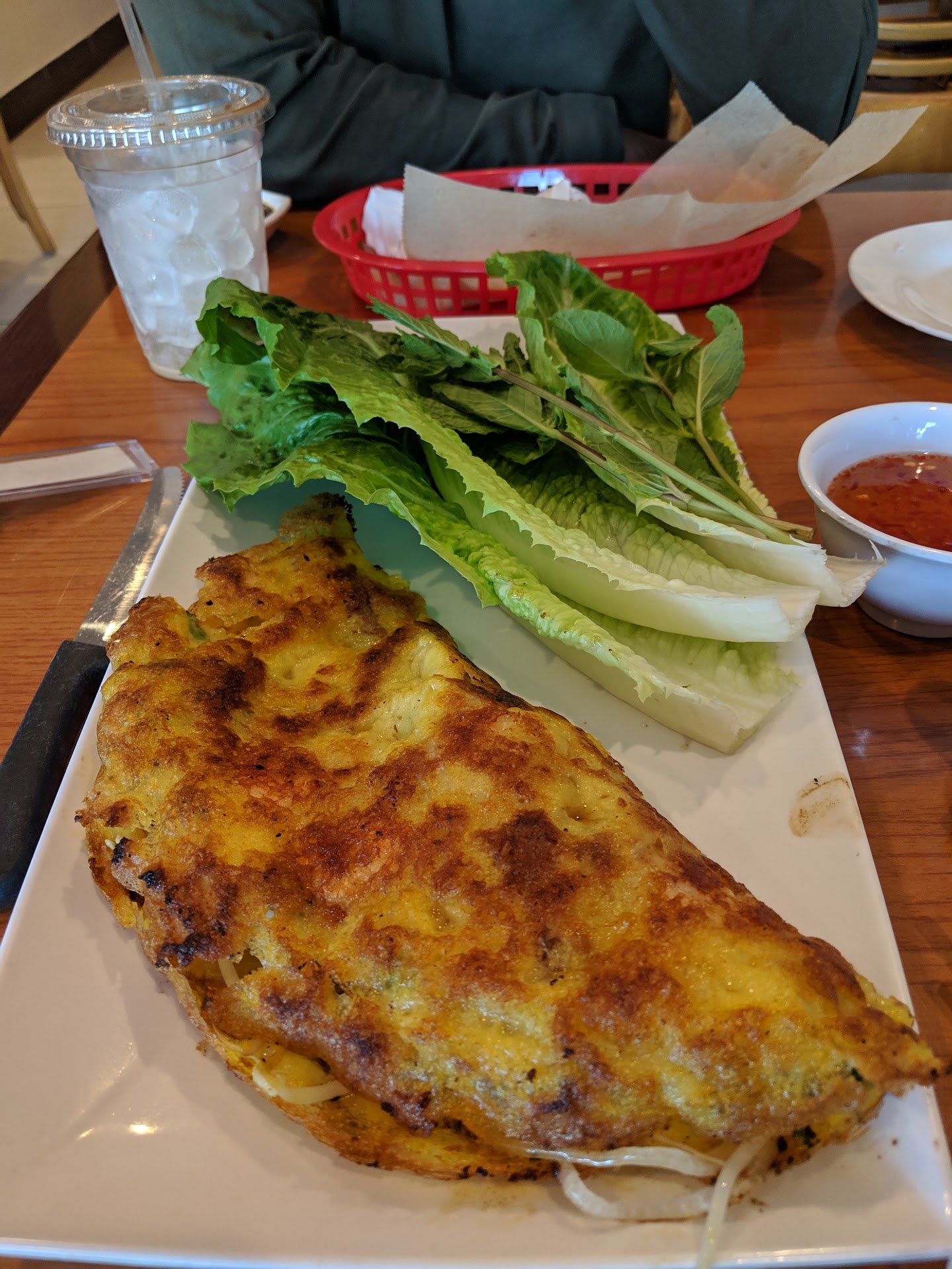 The banh xeo it's basically a Vietnamese style pizza. There is a crispy exterior made from flour and eggs and the color yellow comes from the spices of turmeric. There is bean sprouts, pork, shrimp, onions and it is served on a bed of vegetables. He's vegetables included lettuce and herbs. It was very greasy, making it extremely heavy. On the bright side, the exterior was crispy. 4/5